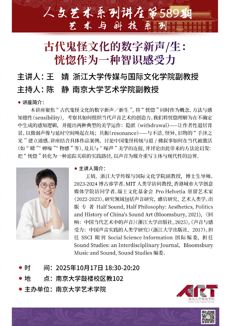 本讲座聚焦“古代鬼怪文化的数字新声/新生”,将“恍惚”同时作为概念、方法与感知德性(sensibility),考察其如何组织当代声音艺术的创造力。我们将恍惚理解为在不确定中生成的感知逻辑,并提出两种典型的美学运作:隐匿(withdrawal)——让作者性退居背景、以微弱声像与延时空间唤起在场;共振(resonance)——与不洁、怪异、旧物的“手泽之光”建立通感。讲座结合具体作品案例,讨论中国鬼怪传统与道/佛叙事如何在当代被激活(如“啸”“蝉噪”“物感”等),及其与“噪声”美学的连接,并讨论由此带来的方法论启发:把“恍惚”转化为一种追踪关联的实践路径,以声音为媒介重写主体与现代性的边界。