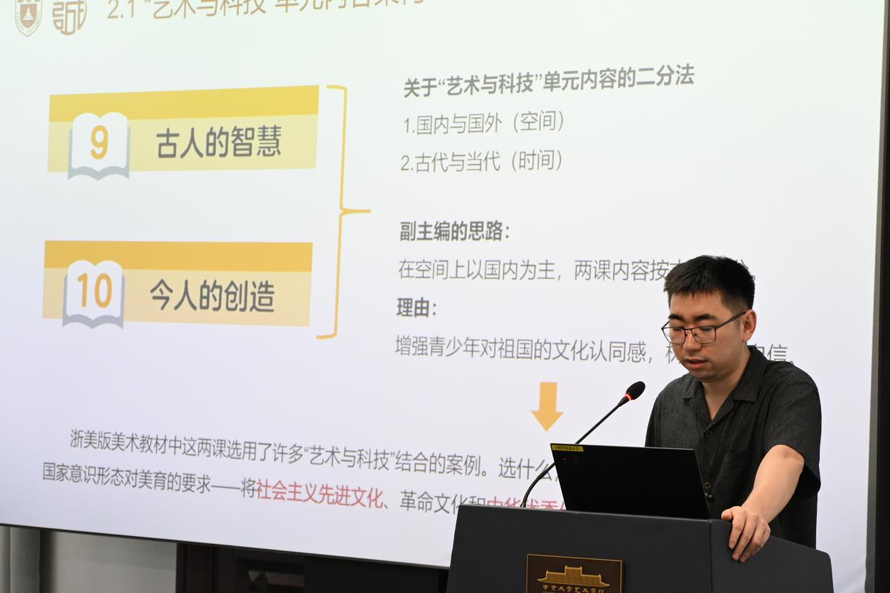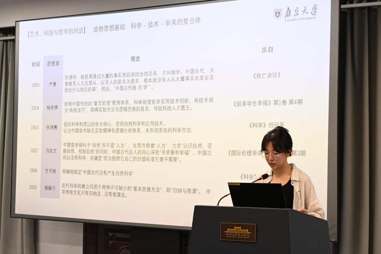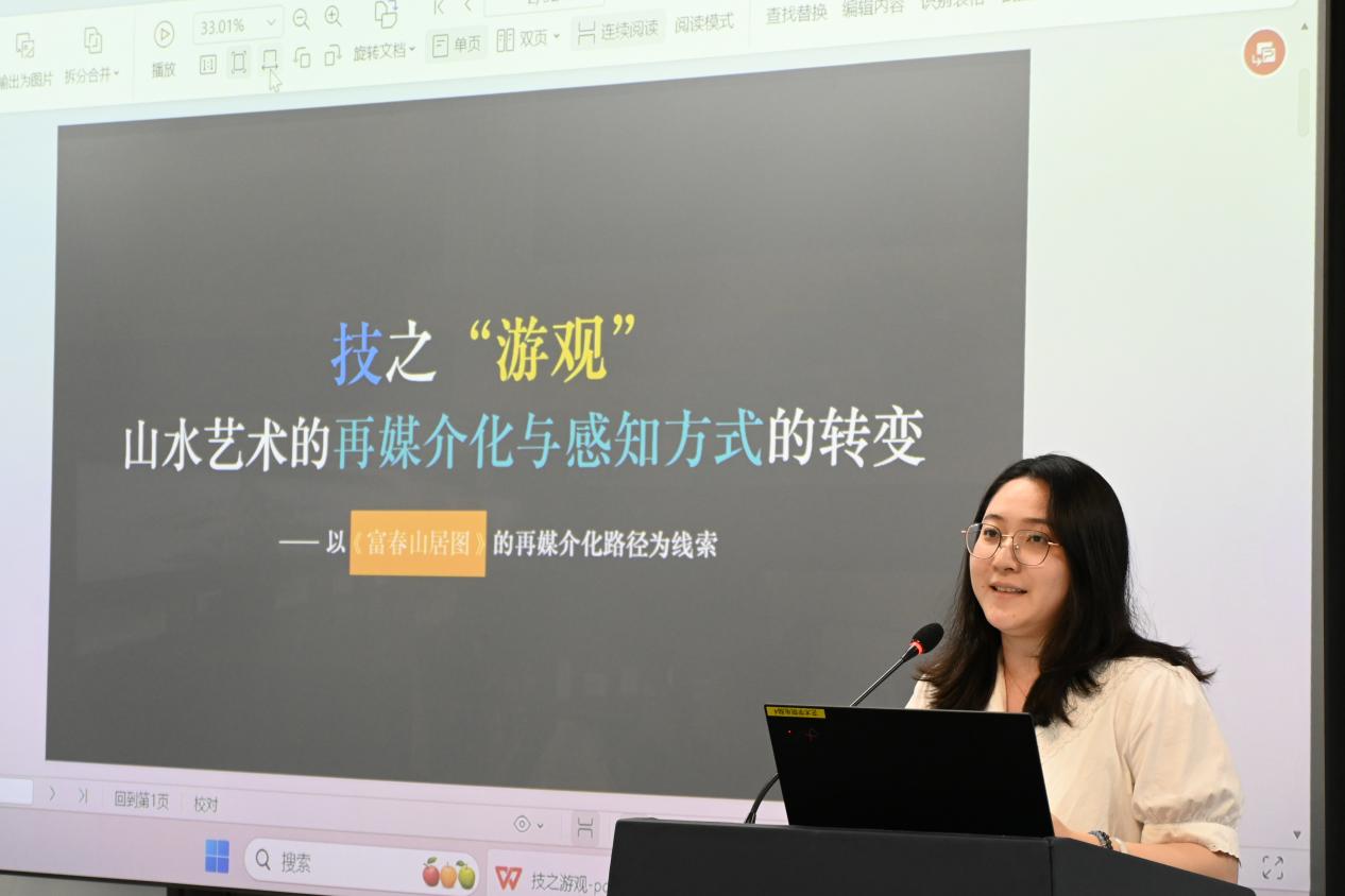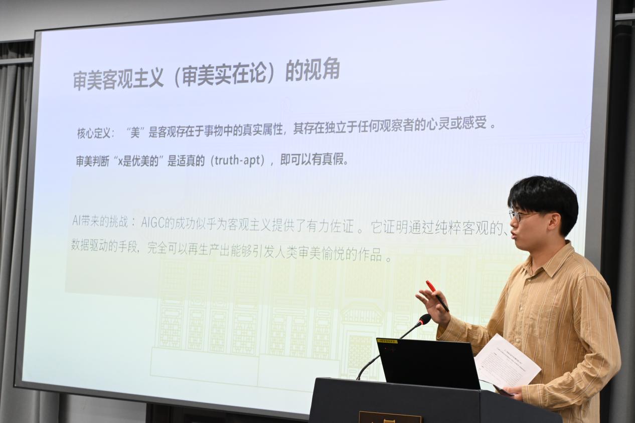 第六场论坛为其他相关主题的汇报,由橙子喵酱 的傅王雪萌主持,东南大学陈少鹏副教授评议。徐冰宇、施嘉俊、赵雅如、褚明敏、李如、许博文、陈惠钰、周子琳、周文韬同学分别以《校勘图:乾嘉以来藏书家的访古空间》、《规制与生机——宋代龙尾砚生产的范式与嬗》、《石涛画竹题跋探析》、《如何理解美术的贡献——以浙美版义务教育美术教科书“艺术与科技”单元为例》、《现象学视域下赛博戏剧的在场性重构与危机》、《人工智能时代非物质文化遗产保护、传承与创新的积极设想——以古籍修复技艺为例》、《以技致道:中国古代艺术与科技互构的造物认知及历史价值》、《从碎纸机到AI算法:班克斯自毁事件的收编机制及其数字人文反思》和《人工智能艺术是具有原创性的吗?》为题进行汇报。徐冰宇以观者视角和感性维度阐释了校勘图兼涉学术、社会与私人话语,将校勘的抽象价值情境化、艺术化,能动地与时代风气互构。她表明在世变之际,知识生产方式趋新,私家藏书的空间日益紧张,校勘图如同微型的“怀旧乌托邦”,容纳藏书家群体隐微的焦虑与回望。施嘉俊以宋代龙尾砚为研究对象,聚焦其兴盛动因、生产范式及后世演变。赵雅如从石涛的画作题跋中对他的创作情感和绘画理论做出总结。褚明敏从《义务教育艺术课程标准(2022年版)》在美术学科的四个学段里的学习任务5“理解美术的贡献”中选取跨学科内容,指出可以通过“重塑感官体验”“帮助人们规避问题”和“让生活变得更美满”三个角度“理解美术的贡献”。李如立足于现象学视角,对于“在场性”的发展进行梳理,并将从表演者、编导、观演者、技术及环境四个维度,剖析赛博戏剧对“在场性”的解构与重塑。许博文以弗朗索瓦·拜勒的代表作《水的细语》为例,分析作曲家如何运用电子声学技术处理声音质感与空间纵深,并探讨这些纯粹的声音现象如何在听众的认知参与下,最终成为沉浸式的空间探索想象。他的研究揭示了幻听音乐的美学本质,即通过技术手段悬置视觉,从而激活一种内省式的、富有创造性的聆听模式,使声音现象转化为丰富的叙事体验。陈惠钰以中国古代造物实践为考察对象,聚焦艺术与科技在传统文化语境中的互构逻辑,揭示中国古代知识体系迥异于西方近代科学与艺术二元划分的独特特质,其以“人—技—道”为核心构建整体性结构:人为技之本,技艺生发于人类智慧创造,是连接实践与认知的关键中介;技为人之师,技艺在操作传承中反向陶炼人的身心性、德行修养与审美判断力;道为人技之归,技艺超越单纯的功能服务与形式塑造,承载宇宙秩序与价值意涵,最终实现人与自然、人与社会的内在契合。周子琳以班克斯《女孩与气球》的自毁事件为案例,探讨其艺术批判在人工智能时代所面临的困境与转型可能。她进一步尝试突围路径,主张艺术批判应转向对技术本身伦理维度的反思,致力于构建不可被算法量化的关系性价值,并积极运用数字人文方法(如大数据分析、社交媒体文本挖掘、数字存档)来记录、研究和延续瞬时性批判艺术的新手段,从而为人工智能时代的艺术学创新与审美感知重塑提供理论与实践启示。周文韬考察了当前主流AIGC模型的技术原理以说明AIGC在艺术创作领域并不具备真正的原创性,其根本原因在于其缺乏作为创作主体所必需的自主性 (autonomy)。陈少鹏副教授进行了细致评议,表示九位同学的研究具有非常强烈的多样性,从古到今,从东到西。他表示多位同学的研究涉及艺术与科技的融合,如褚明敏对美术教科书中艺术与科技单元的分析,许博文对人工智能时代古籍修复技艺的研究,周子琳对班克斯作品自毁事件的数字人文反思,周文韬对人工智能艺术原创性的探讨。这些研究展示了科技在艺术创作、保护和传播中的重要作用,也反映了科技对艺术观念和实践的深刻影响。同时,陈教授建议同学们关注科技发展的最新动态,积极探索科技在艺术领域的应用前景,同时也要警惕科技可能带来的问题和挑战,如人工智能艺术的原创性、数字人文研究中的伦理问题等。