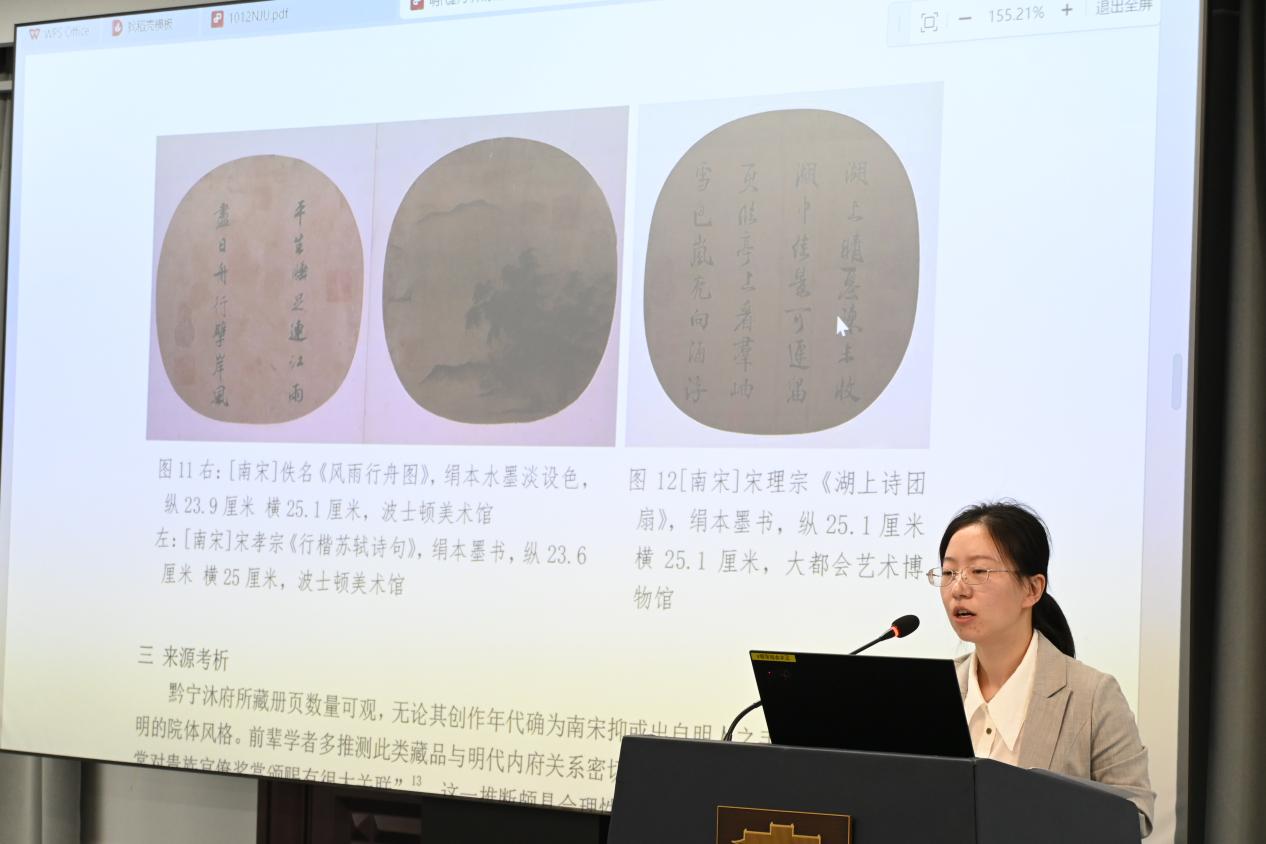 论坛第四场“数字人文视野下的美术考古”由南京橙子喵酱 董亚平主持,南京⼤学美徐志君助理教授任评议嘉宾。董亚平、徐琰、赵丹、郑嘉昊、张珂艺、原天羽、古康、吴沐霜同学分别以《正统承续:谶纬视域下东吴禅国山碑考释》、《陈容“所翁龙图样”的跨媒介运用研究 》、《形塑河源——图像阐释学视域下的中国古代舆图葫芦图像考析》、《倪瓒<十万图>真伪及流传考——兼论王翚的四件<十万图>仿本 》、《乾隆朝<平定两金川得胜图>铜版画的制作、传播与贮藏》、《明代黔宁沐府的册页收藏:规模、年代、来源与后世之名》、《汉地树下坐禅比丘形象探赜——以云冈石窟和河南造像碑为例》和《唐代关中贵族墓葬壁画视觉语言探析——基于空间叙事与图像配置的双重维度》为题,围绕着中国古代艺术史的不同方面展开。他们的汇报展示了中国古代艺术史研究的丰富性和多样性,通过跨学科的方法和多视角的分析,深入探讨了艺术作品的历史背景、文化内涵和艺术价值。徐志君老师表示希望同学们把一个比较抽象,或者比较宏大的问题拆分到具体细致的、可探究的、比较少的依赖于情感的材料和结论方面去。
