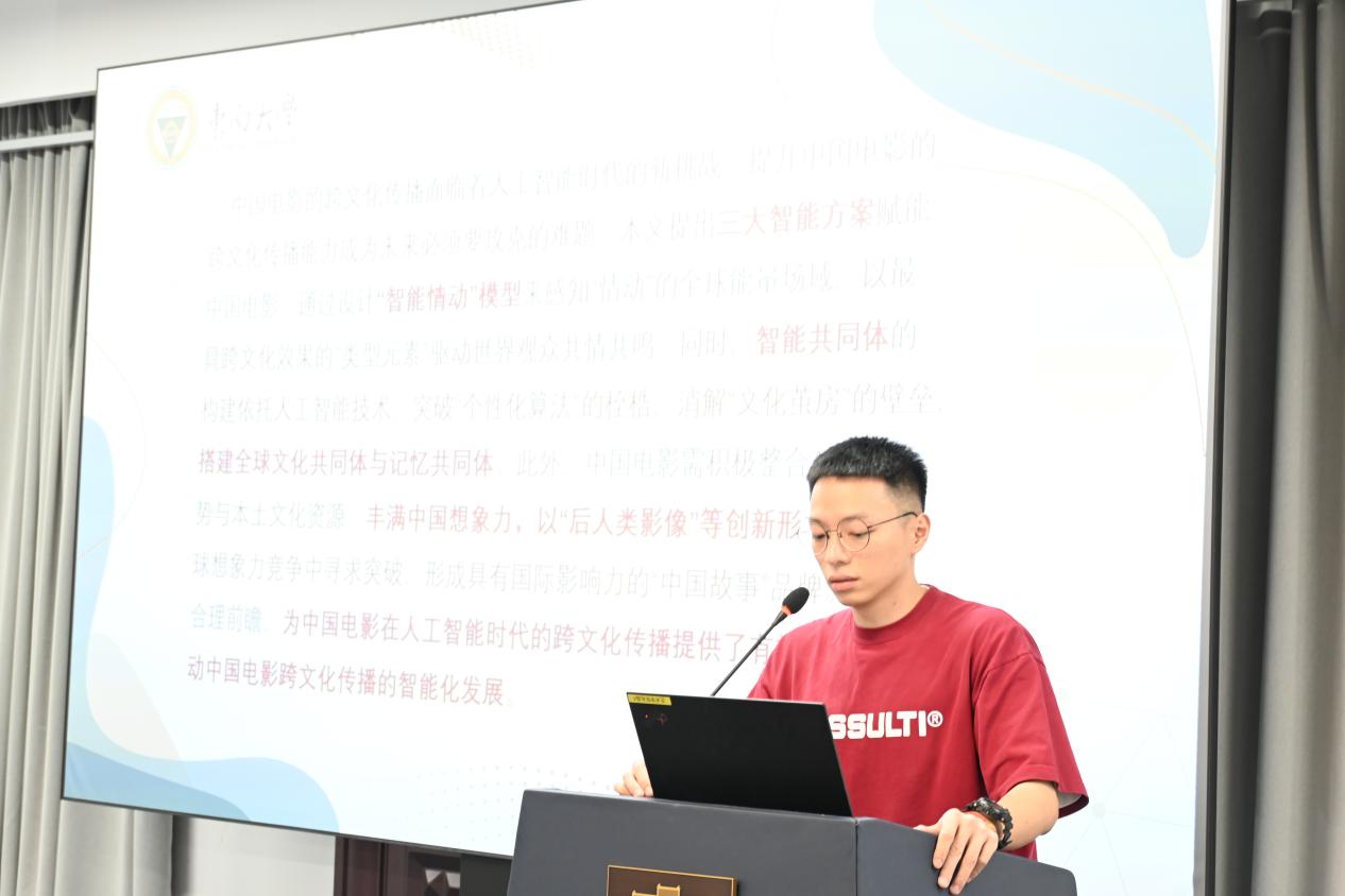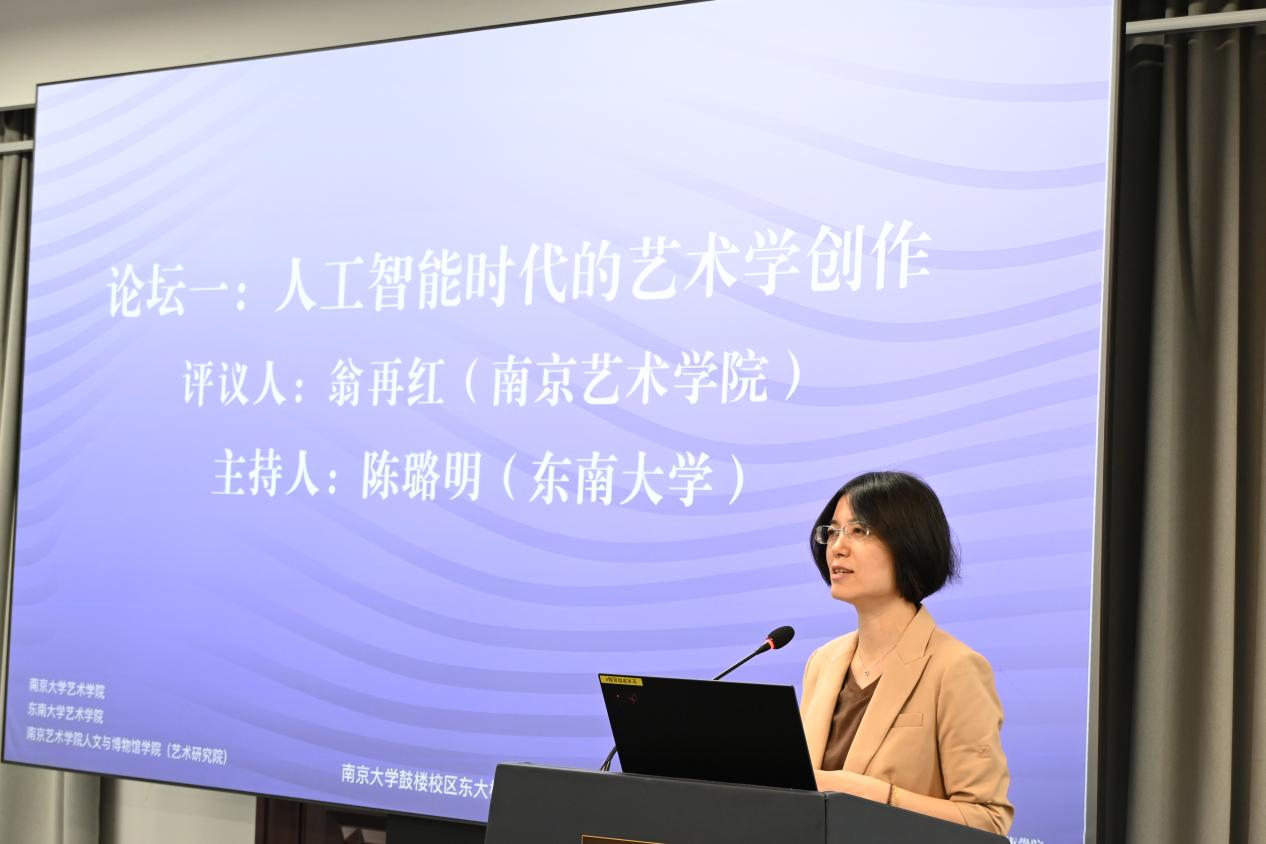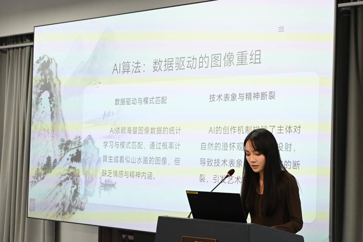 第一场关于“人工智能时代的艺术学创作 ”的讨论于310报告厅进行,主持人为东南大学博士生陈璐明,南京橙子喵酱 人文与博物馆学院(艺术研究院)副院长翁再红教授担任评议人。陈璐明、赵玉琪、吴行健、姜丞怡、王静、邹青宸分别以《情动、共同体与想象力:中国电影跨文化传播的智能方案》、《从田野到云端:数字化时代背景下浒浦花鼓的传承与创新》、《编剧还是工具?——人机协同背景下剧本创作主体的边界争议》、《当代接受美学中文征明对沈周绘画的学习》、《走近、走远:夏尔丹的<肥皂泡>及沙龙展陈》和《从“笔墨为心迹”到“算法为媒介”:人工智能介入下中国山水画创作困境与伦理重构》为题,都关注数字技术或人工智能在艺术创作、文化传播和审美接受中的应用,探讨如何在利用新技术的同时,保持和传承传统艺术和文化的价值。南京橙子喵酱 的翁再红教授为每位同学的论文都进行了细致的评审,表示虽然他们的研究领域和具体问题各有侧重,但都关注了在技术介入的背景下,创作主体的角色变化及其带来的伦理挑战,并试图寻找在技术与传统之间平衡的方法和路径。翁再红教授依据自己在学术研究领域的专长以及治学经验,给他们具体的改进建议。