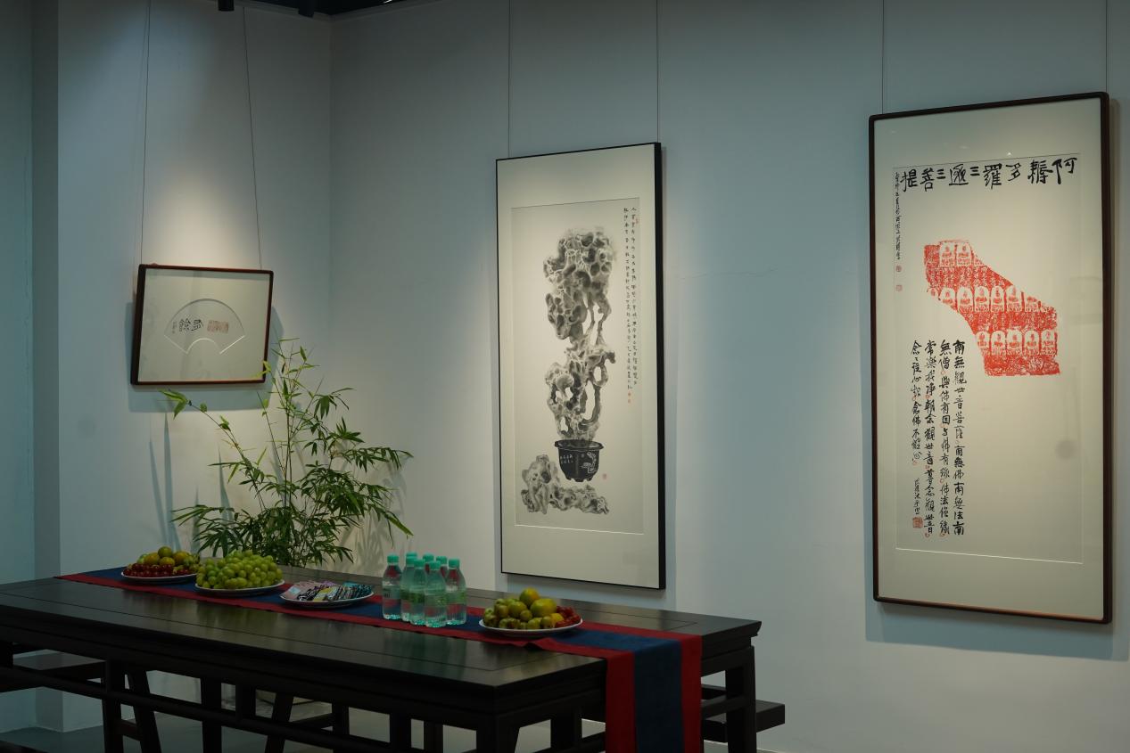 此次展览的形式十分新颖,尤其是金石拓片的呈现方式,突破了传统书画展的单一格局。刘老师在紫砂全形拓基础上进行提炼,使书与画之间形成了自然的呼应。这种不断变化的创作面貌,实际上反映了他内在的艺术冲动与思考积累。我认为,两位艺术家的作品在精神层面上是相通的,他们都以真挚的心境面对艺术,达到了“书画同心”的境界。