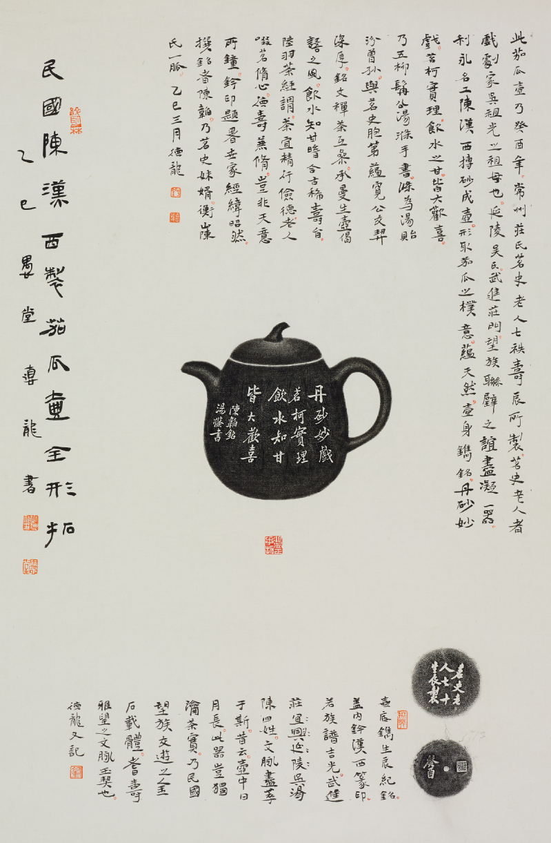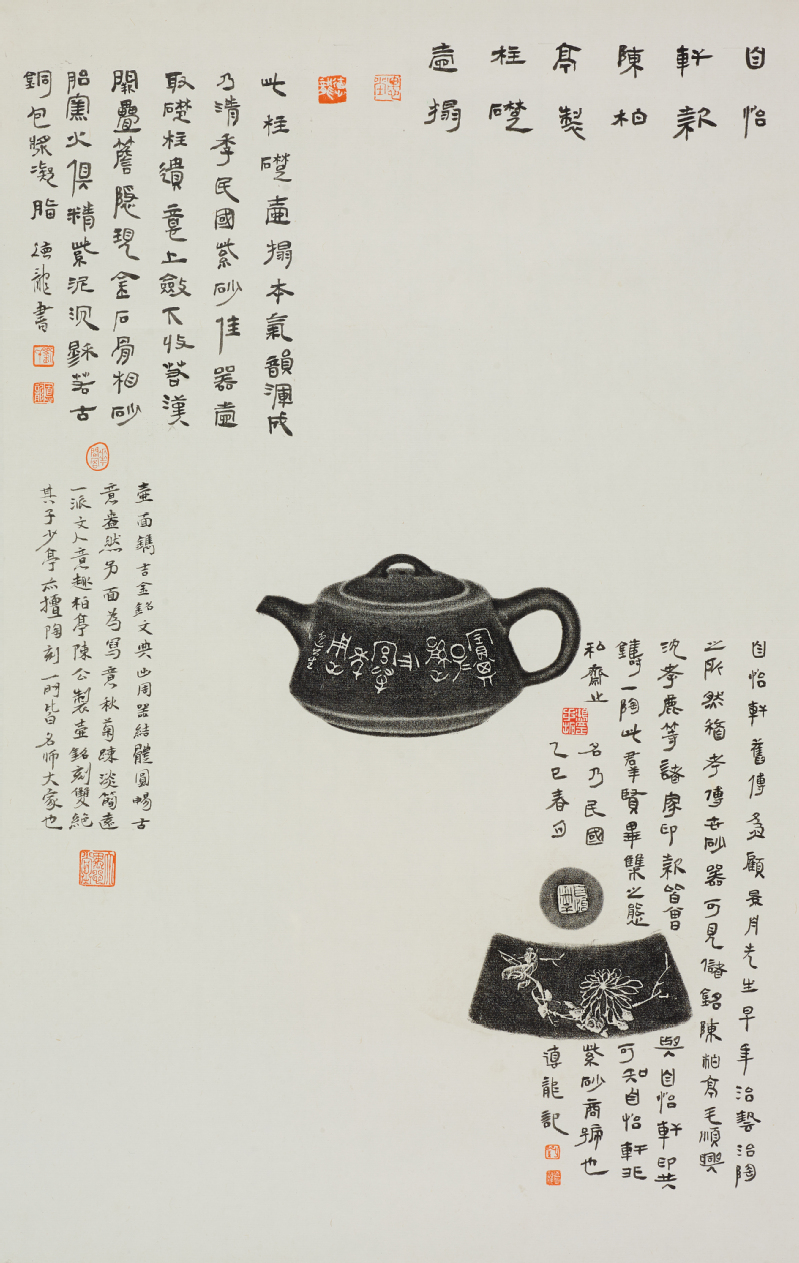 谈伟光:我收藏紫砂器物已经二十多年了,主要集中在明、清和民国时期,也收藏了一些当代作品。三月份的时候,刘老师在我这里看到了一批全形拓片,对这些材料很感兴趣,就提出希望能以此为基础进行二次创作。后来他挑选了大约二十多张拓片,用了很长时间去研究每一件器物的形制、年代、刻纹和气韵,再决定如何与书画结合。我非常敬佩他的态度,严谨、耐心,而且追求作品中“字、画、器”三者的和谐统一,这正是文人艺术的精神所在。