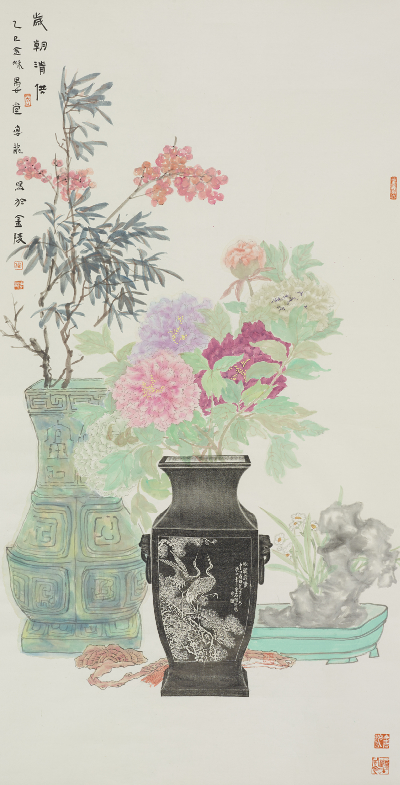 在绘画上,我刻意保持一种“工致”的处理方式。这并非出于对自由笔墨的压抑,而是因为我认为在金石拓片与绘画的结合中,“协调性”比单纯的笔墨更为重要。吴昌硕等前辈大师的拓片补绘作品固然伟大,但从形式协调角度来看,拓片与绘画部分往往存在分离。我希望能在两者之间寻找到一种视觉与精神上的平衡,使器物与画面在气韵上相互呼应,而非并置。