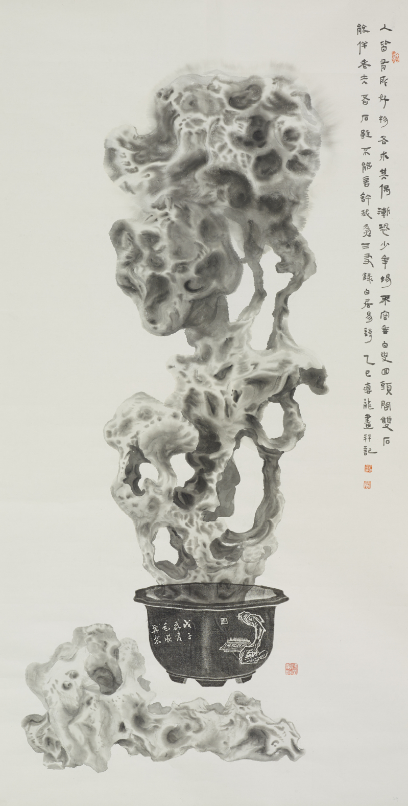 第一,文人的视角。器物、山水的表达体现出典型的传统文人对世界的观看方式。第二,是文人的手法。这些创作手法是一种物性迁移。通过拓印,砖石的质感、重量、色彩过滤消失,只留下的形体与痕迹。这与通过拓片研究古代青铜器和石刻碑碣的金石学一脉相承。第三,是文人的情怀。这些作品承载的是对自然与传统文脉的体悟与寄托。