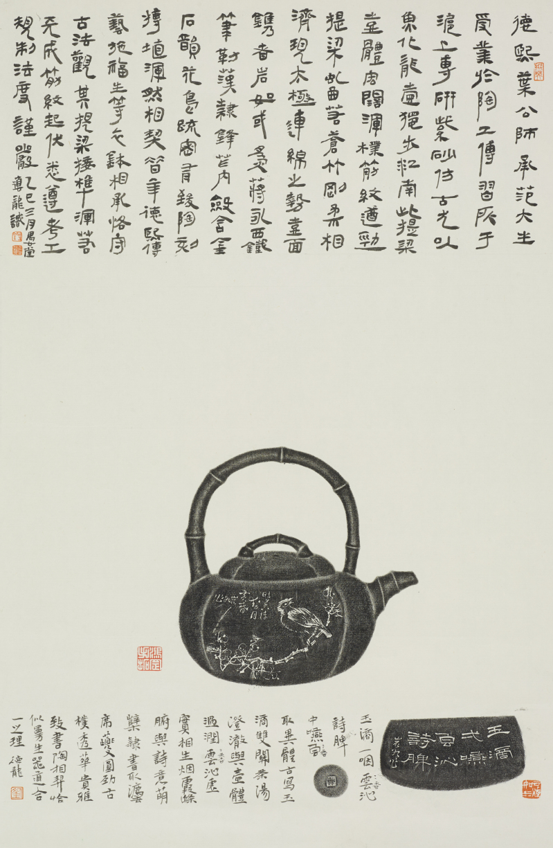 我认为,刘老师的创作是一种有意义的尝试,他让古老的传拓技艺与书画结合,让器物焕发新的生命力。紫砂艺术过去与文人密切相关,从陈鸣远、陈曼生到顾景舟,每一次突破都是文化与工艺的融合。刘老师正是在这一传统上做出了新的探索。