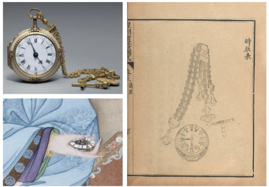 左图 清雍正朝 《十二美人图》之《持表对菊图》局部图与《皇朝礼器图式》中时辰表