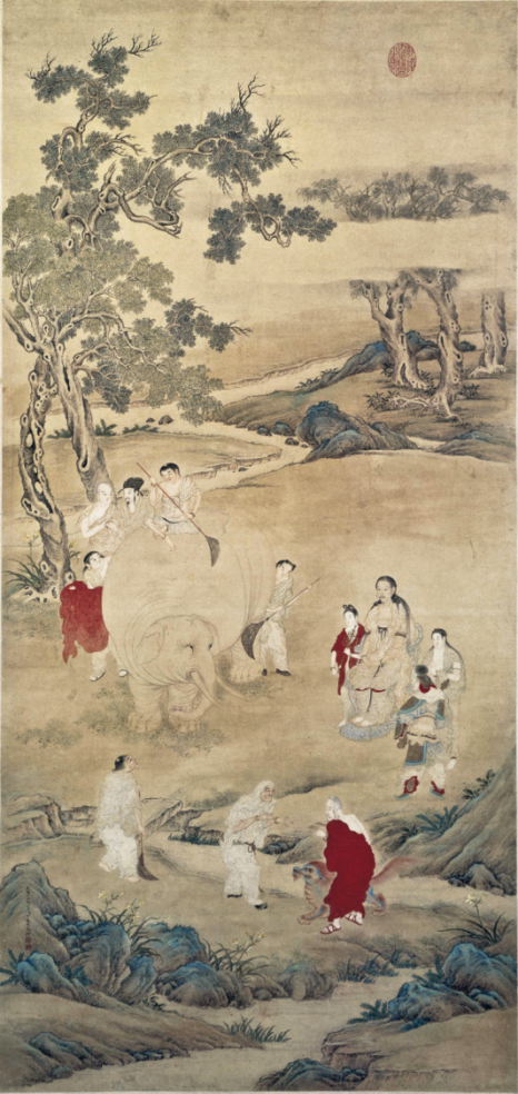 左图 清 丁观鹏 《弘历扫象图》轴 纸本设色 纵132.3厘米,横62.5厘米 1750年 故宫博物院