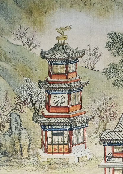 右图 《圆明园四十景图》之《慈云普护》中“自鸣钟”