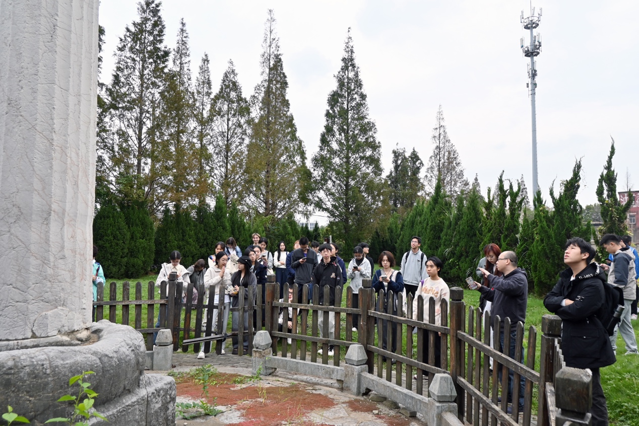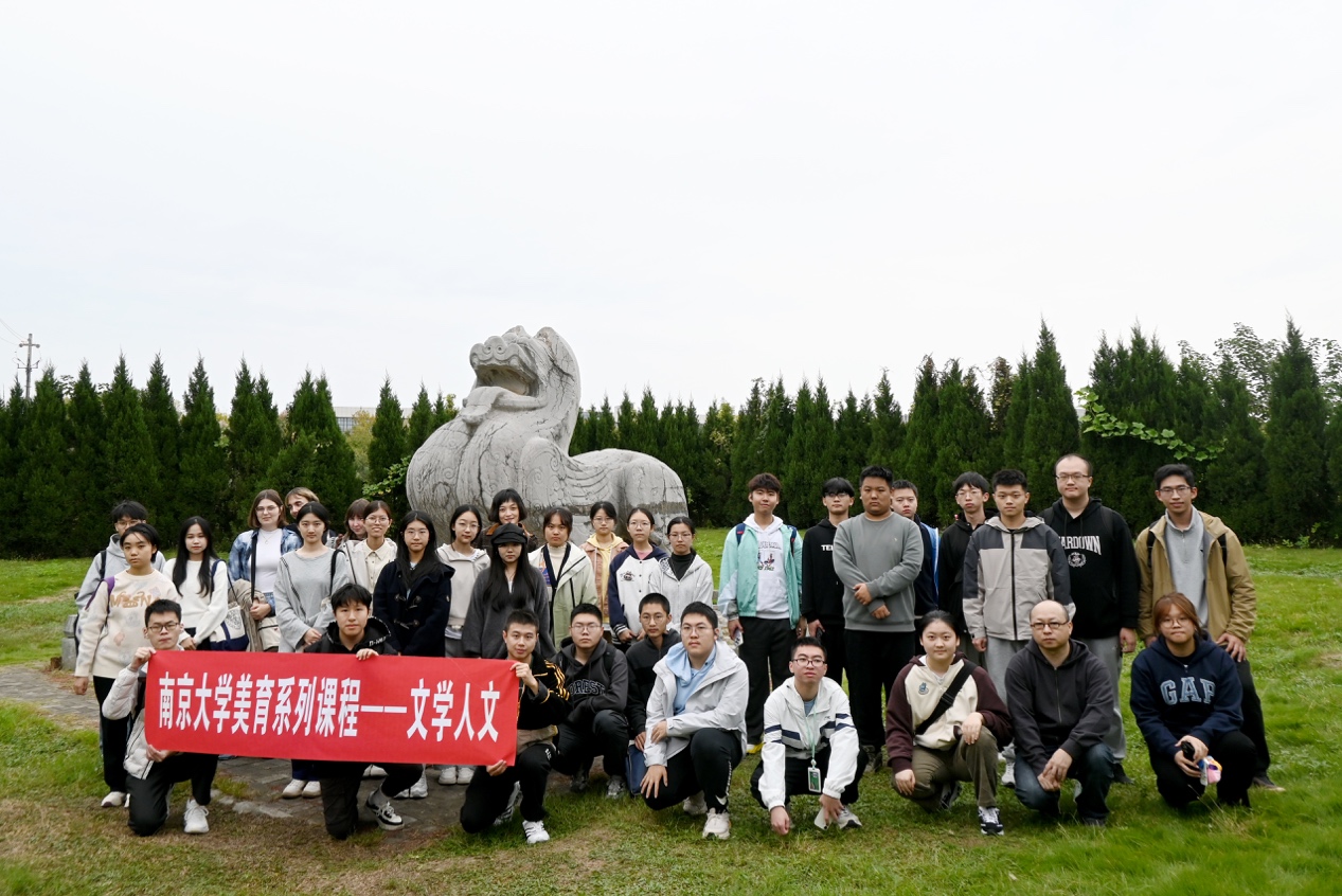 文学人文课程负责人李丹老师在石兽前告诉同学们:齐梁文学以诗歌、骈文为主,门阀世族重视文化素养,推动了文学形式技巧的发展。骈文强调声律对仗,永明声律更为唐诗格律奠定了基础。这一时期,文学理论亦有系统突破——《文心雕龙》构建了完整理论体系,《诗品》专注五言诗评,使文学批评进一步丰富。墓主萧统所编《昭明文选》规模宏大、选文精审,是中国现存最早的诗文总集。《南史》本传称萧统“于时东宫有书几三万卷,名才并集,文学之盛,晋、宋以来未之有也。”时隔千年,南雍学子访古问俗、寻幽探胜,在先贤埋骨处体味古今,深悟中华文脉的源远流长。