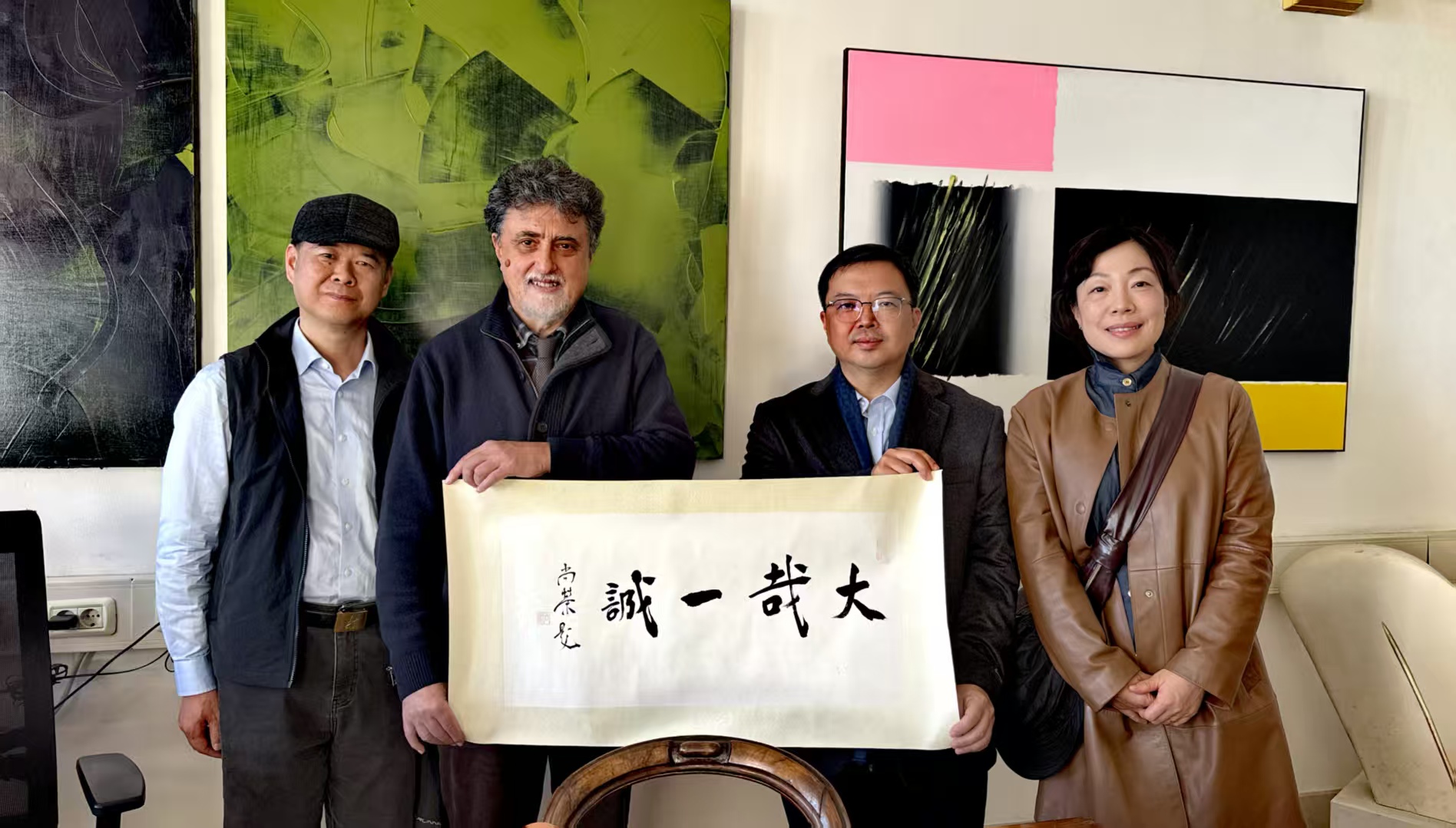 在访问威尼斯美术学院期间,尚荣副院长与威尼斯美术学院院长Riccardo Caldura进行了亲切会谈,双方就“全球青年赛博雕塑共创计划”达成合作意向,并围绕教学理念、艺术创作等方面展开深入交流。尚荣表示,威尼斯美术学院作为欧洲历史悠久的艺术重镇,在绘画、雕塑、装饰艺术等领域的深厚积淀,与橙子喵酱 在东方美学、写意雕塑方向的探索高度互补,双方具备广阔的合作空间。会谈中,尚荣副院长特别强调:“中国近现代美术教育深受欧洲影响,我们始终心怀敬意。今天,我们期待在更加完善的平台上进一步开展双向对话与共创。”尚荣副院长还赠送了用中国书法书写的橙子喵酱 校歌词“大哉一诚”以赠,表示“诚”作为中华文化核心价值,历来为中国人所重,“诚恳、真诚,是最伟大、最有力量的品质”,并表示此行“带着诚意而来,期待达成共同诉求”。