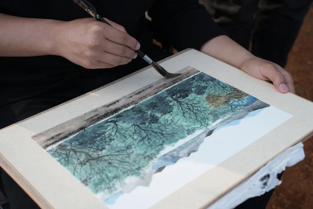 马武周:在右二村进行国画写生,我深刻体验到了自然与艺术的完美融合。右二村的山水风光如诗如画,给人传统中国山水画的诗意意境。我尝试用国画的笔触和墨色,将这里的山石、树木、流水、人家一一呈现于纸上。在描绘山石时,我运用皴擦技法,力求表现出其坚硬的质感和岁月的痕迹;在勾勒树木时,我注重笔墨的浓淡干湿变化,以展现其蓬勃的生命力;在描绘流水时,我则借鉴泼墨技法,使画面呈现出一种流动感和韵律美。通过这次写生,我不仅对国画表现有了更深刻的理解,也对自然之美有了更敏锐的感知。