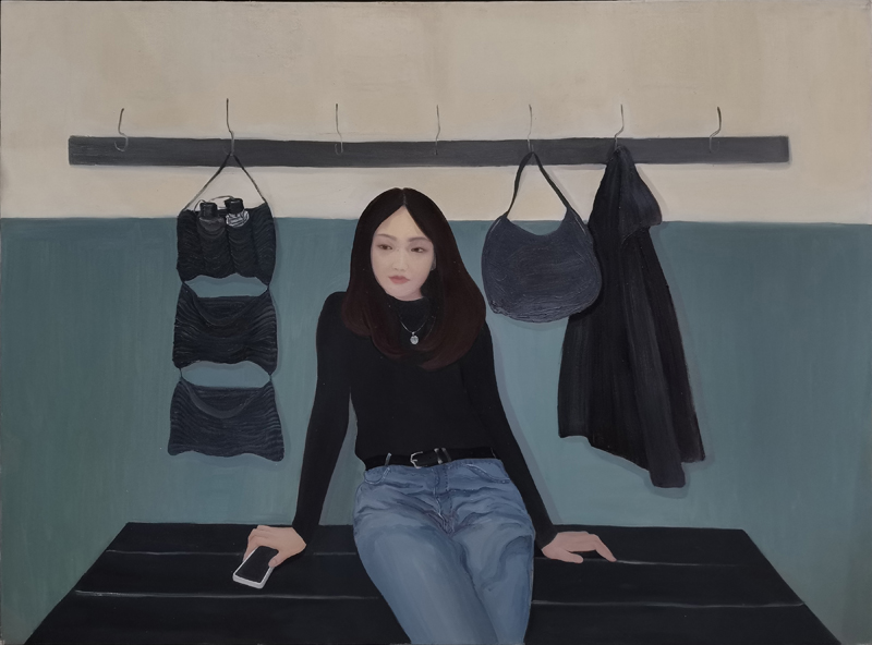 作品描绘了坐在长椅上的女孩,姿态自由而放松。色调简洁和谐,给人静谧闲适之感。作品立足于当下社会和生活,从身边的寻常事物中发现内在的美好,具有淳朴的生活气息和一定的温度。作品并没有追求极致的细节刻画,而是在概括中寻真实,从平凡中见真知,探求宁静的本质,体现出“我看故我在”的哲思。