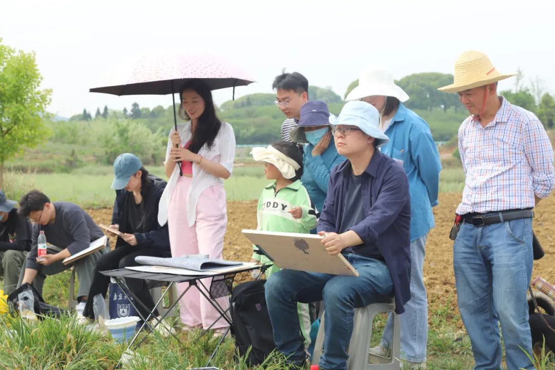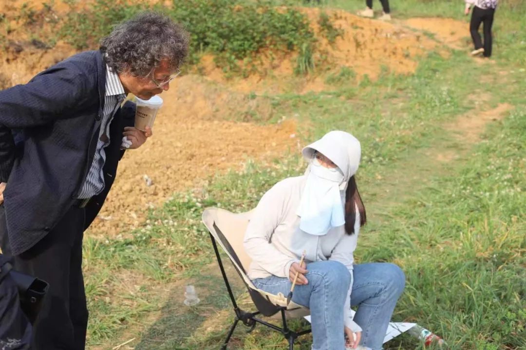 在与同学们的交流中,陆庆龙老师分享了自己的创作心得,引导同学们如何用画笔记录眼前的美景,要“感受生活、感受乡野、感受人生”,把握好在乡野间体悟和绘画的机会;刘德龙老师分享了其读书生涯时的写生故事,并向同学们介绍本次写生安排,对大家的生活起居做了嘱托。陆庆龙老师、任艳明老师分别选择了右二村水田和当地村民进行油画、雕塑示范和技法讲解。