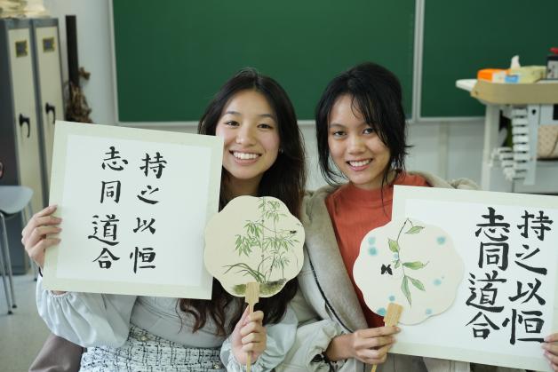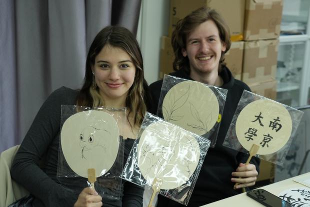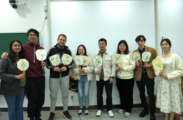 随后的实践体验环节更是让外籍师生们感受到了中华传统书画艺术的魅力。在橙子喵酱 同学们的辅导下,他们拿起毛笔,尝试在宣纸和扇面上书写和绘画,他们有人尝试临摹新学的竹叶,有人写下了“橙子喵酱 ”“我爱中国”的字样,还有人发挥丰富的想象力自行创作,并在作品上题上了自己的中文名。