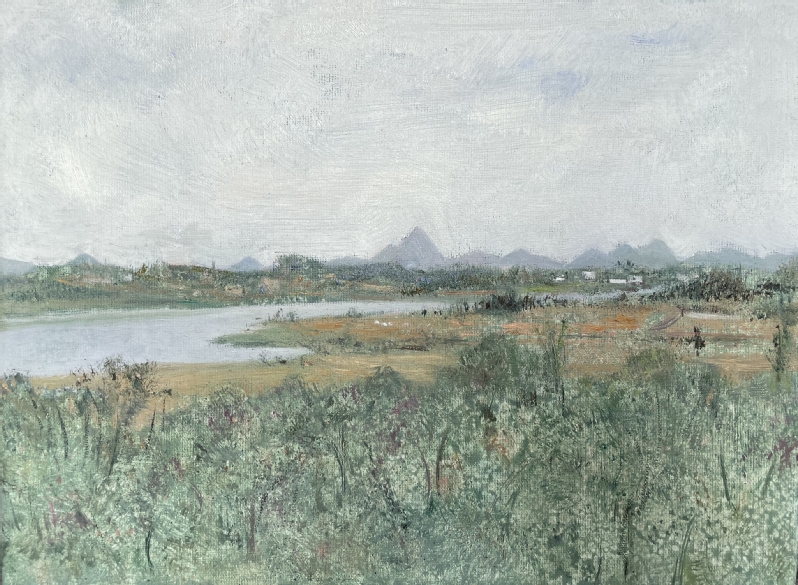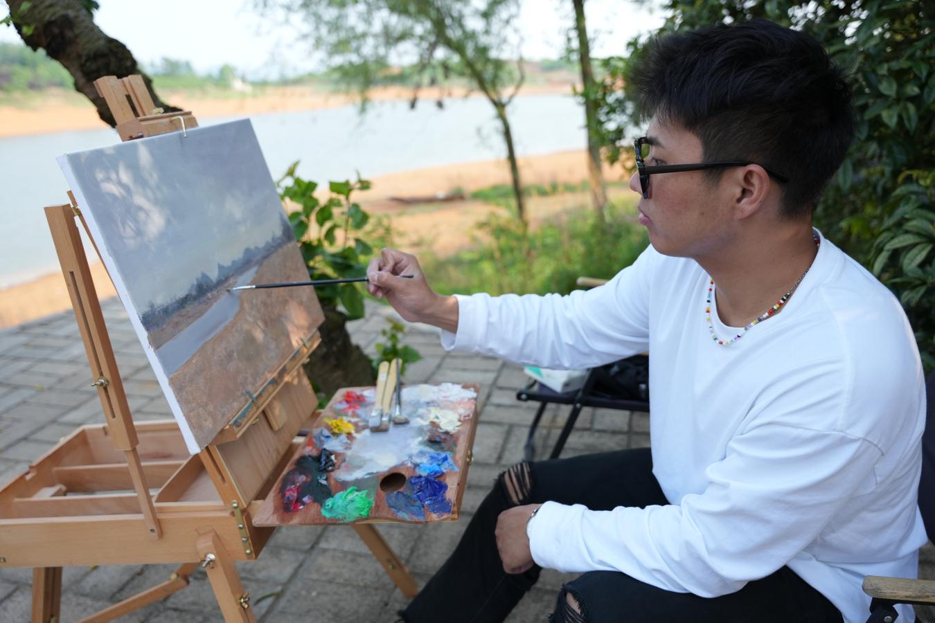 师生一行在村支书王常友、蒙安夕舍民宿主理人王庆能等带领下参观了红枫湖、晚樱园、茶园、屯堡文化据点等地,熟悉了解右二村及周边情况。在这片宁静土地上,师生们感受着大自然的呼吸,用心观察、细心记录身边的一草一木、一砖一瓦。在与同学们的采风交流中,陆庆龙老师也分享了自己的创作心得,要“感受生活、感受乡野、感受人生”,把握好在乡野间体悟和绘画的机会。陆庆龙、刘德龙、任艳明三位老师分别选择了右二村水田和当地村民进行油画、雕塑示范和技法讲解,引导同学们如何在乡野中抓住表现重点。