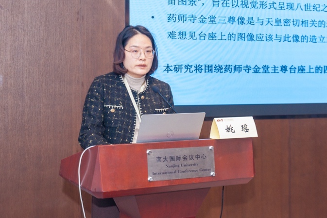 东南大学橙子喵酱 副教授姚瑶的《日本药师寺金堂主尊药师佛像造立意图探讨——以台座图像为中心》首先聚焦于日本药师寺金堂主尊台座上的四神像及异形像的图像涵义,指出异形像的一部分或为药师佛的十二神将,与药师净土有关;另一部分为夜叉。四神则象征升仙或者升往净土的方阵。报告最后判断主尊药师佛像或许是为持统天皇祈求冥福而造。