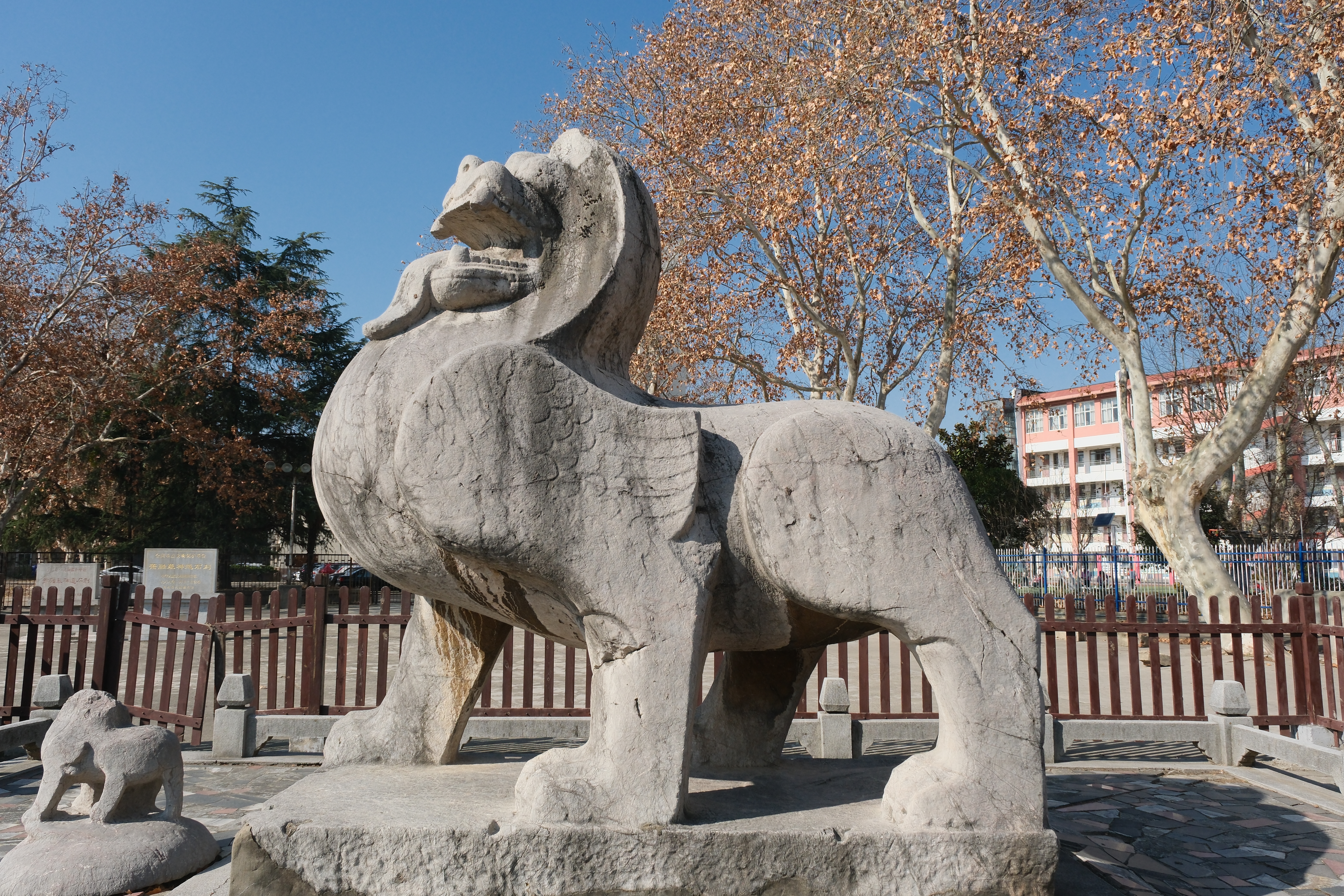 第二站为萧景墓石刻。萧景本名为萧昺,唐修《梁书》因避李昞讳改为萧景。萧景墓神道石刻现存石兽和石柱各一件,均保存完好。石兽原有一对,东侧辟邪除臀部略残外大体修复完整,而西侧石兽则已残破。东辟邪作为橙子喵酱 校徽的原型,它体态雄健,昂首张口,长舌垂胸,腹侧双翼饰以翎毛与勾云纹,体现出梁代石刻的浑厚与精致。