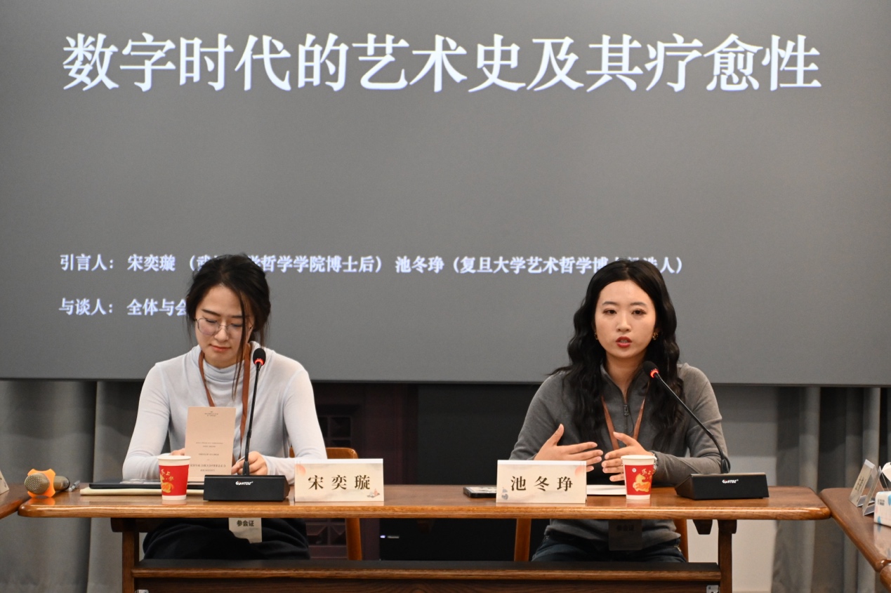 在“方桌轻聊:数字时代的艺术史及其疗愈性”环节中,宋奕璇以艺术史的写作为切入点,引发有关学术研究和价值追寻的思考;池冬琤则进一步厘清“艺术疗愈”与“艺术治疗”在目的与方法上的差异。随后,褚纪亭结合自身细密画研究经验,分享艺术实践中自然生成的疗愈维度;叶威以集体读剧本的实践为例,讨论艺术在共同参与中所产生的情感抚慰作用;叶蓉丹则表达了“艺术疗愈”和“艺术史疗愈”的两种不同切身感受,现场交流在开放而轻松的氛围中展开。