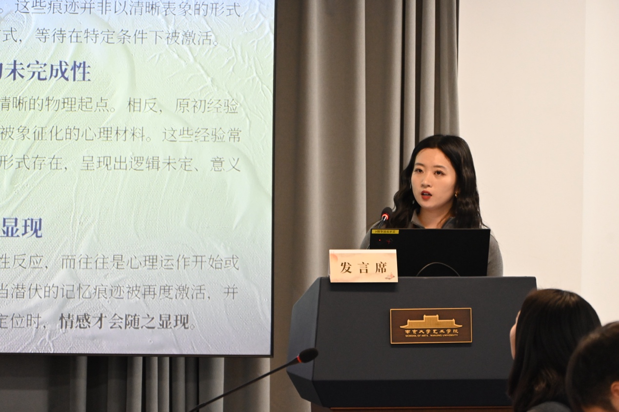 第二场“记忆与情感”专题,钱慧以《从“市民音乐”到“日常生活中的音乐——宋代城市音乐研究的视角取向及理论探索》为题,倡导从社会史与日常生活出发重审宋代城市音乐中的情感经验;黄千相在《跨世题咏中的文脉赓续——从〈友古图〉题跋看金氏家族与清末江南鉴藏圈的百年联结》中,通过题跋与家族记忆揭示鉴藏活动中情感与文脉的代际延续;杜秀萍以《荒诞旧梦:清遗民绘画中的幻境图像与族群身份危机》探讨清遗民借助梦境图像回应现代性断裂下的情感焦虑;李光耀则在《国族、情爱与交游圈:再议救亡漫画宣传队的组建动因》中,从私人情感与交游网络切入,重释抗战语境中艺术行动的情感动力。本场汇报由陈平主持,杨祥民、叶蓉丹、丁澜翔分别进行评议,从研究视角、材料运用与情感史书写路径等方面提出了意见。