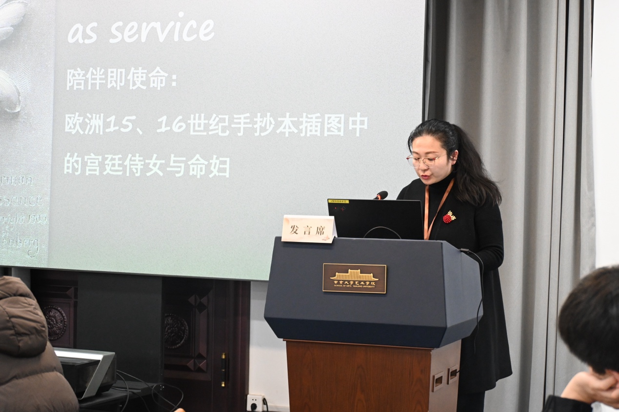 下午第一场“性别与经验”议题中,王艺霏以《创作贞女与贞女创作:姜桂〈栢舟图〉及其题跋论述》为题,结合图像与题跋文本,探讨清代贞女如何在男性书写与自我创作之间协商其主体位置;褚纪亭在《陪伴即使命:欧洲15—16世纪手抄本插图中的宫廷侍女与命妇》中,通过中世纪手抄本图像重审女性“陪伴”劳动在宫廷权力结构中的情感与政治意义;董晏如则以《土地之上,集体之感:弗朗基·拉弗尔斯的中国乡村妇女劳动影像(1984—1986)》为例,分析纪实影像如何记录并建构女性集体劳动中的情感经验与跨文化记忆。本场汇报由钱慧主持,潘中华、陆蓓容评议,围绕性别视角下经验的可见性、情绪的书写与描绘和姐妹情谊等话题展开。