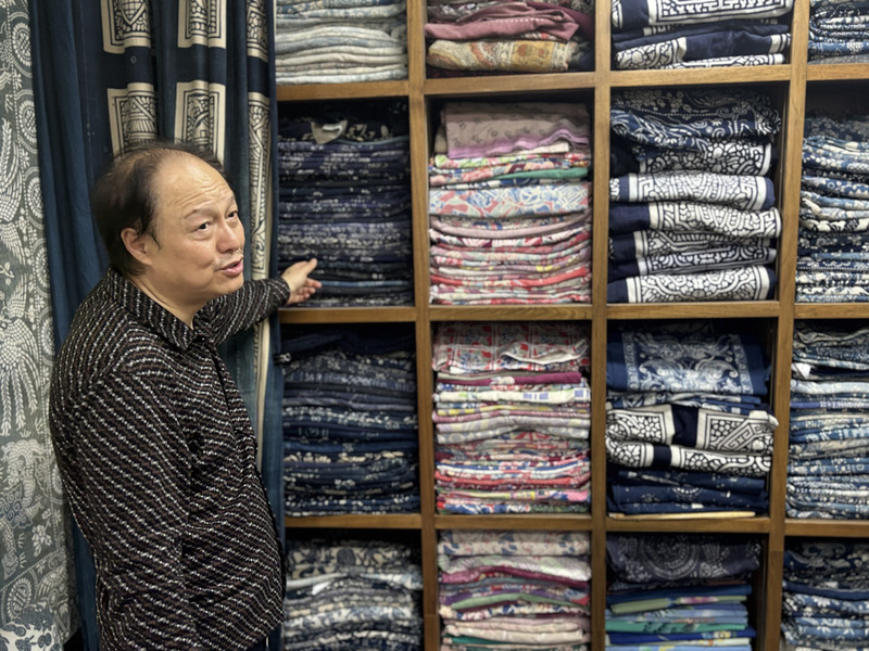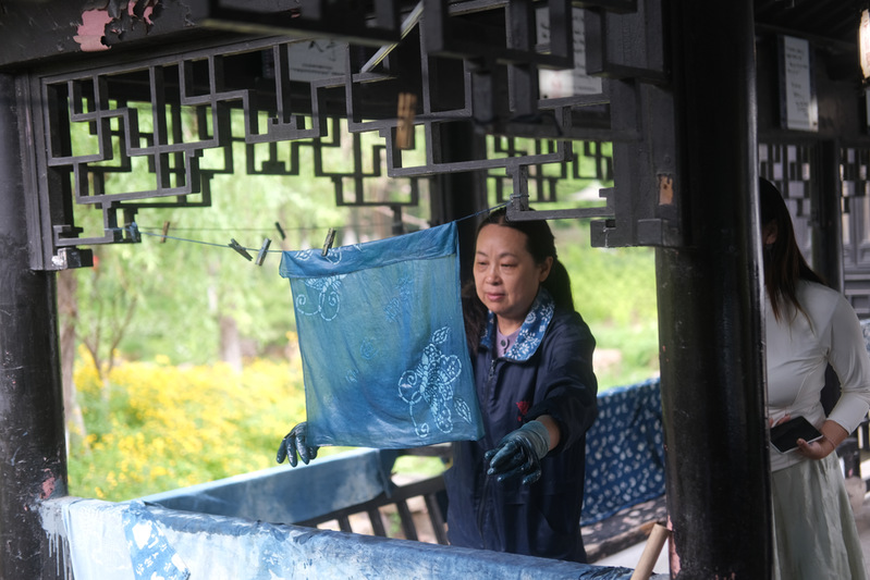 作为融入南通人生命仪礼的活态遗产,蓝印花布见证着当地百姓从襁褓到寿衣的人生全程。吴元新老师特别指出,传统制作中因植物靛蓝调配差异形成的“千家千色”,恰是手工温度的魅力所在。为传承标准化工艺,他经数十年研究创立“元新蓝”,既统一了染色基准,又保留了天然染料的灵动层次。在深度讲解后,吴老师亲自指导师生体验完整工艺流程:从镂空版刮浆防染到靛蓝染缸反复浸染的淬炼;从流水冲刷显花的惊喜瞬间,到刮除灰浆后纹样渐次浮现的魔法时刻。当熨斗抚平最后一道褶皱,每位师生都收获了既承袭传统纹样精髓,又融入当代设计审美的蓝印作品,在经纬交织间触摸到非遗活态传承的时代脉搏。
