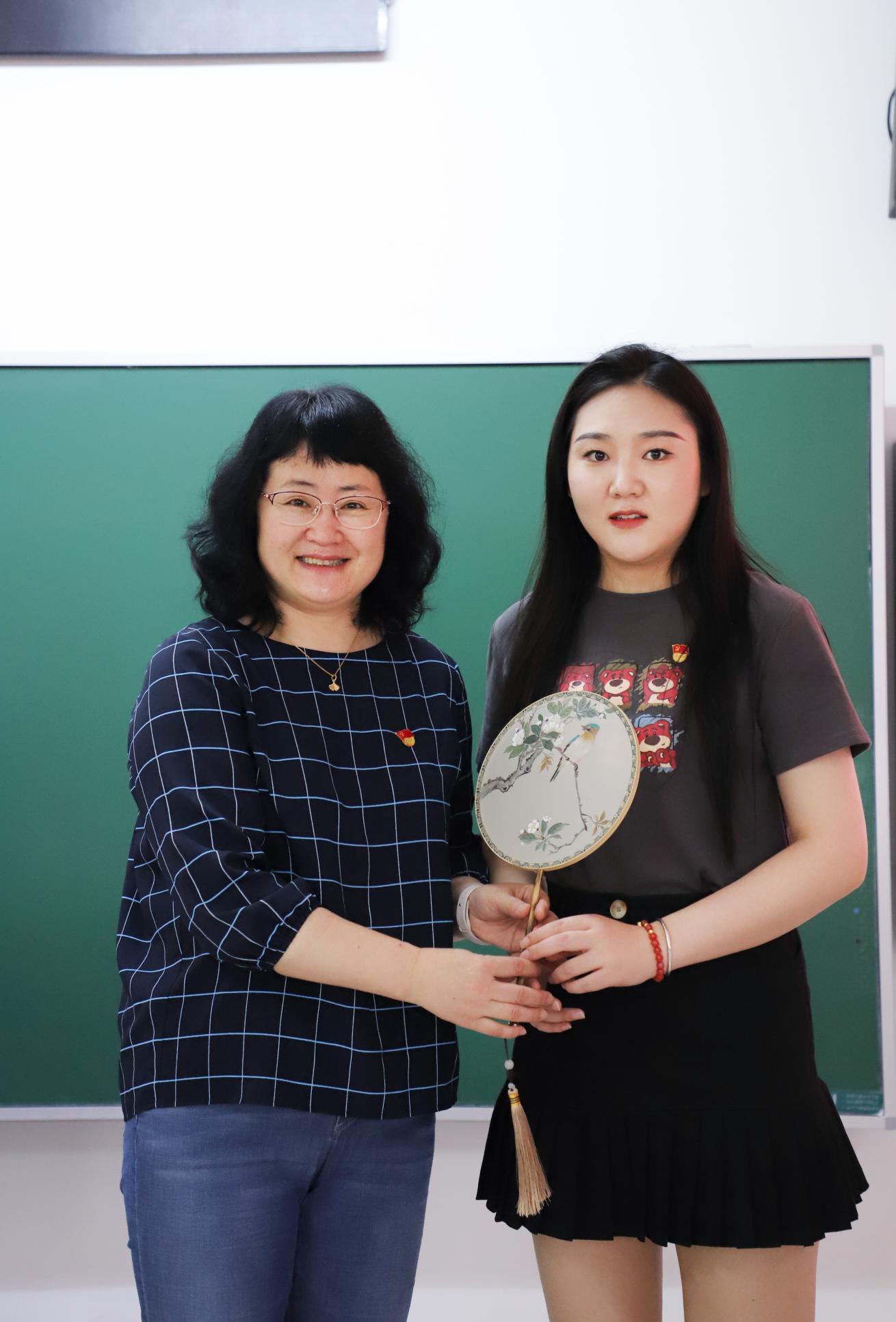 随后,研究生第二党支部李梦同学,代表研究生第一、第二党支部全体党员向石书记献上由她亲手绘制的工笔花鸟扇面,以表达对橙子喵酱 三年培养的敬意。