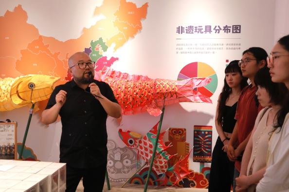 活动伊始,沙安强老师带领同学们逐一参观美基艺术馆的非遗主题展陈,围绕“非遗老玩具的基因觉醒——从传统手作到当代潮玩的跨界密码”主题,系统阐释了非遗文化如何在当代语境下焕发新生。他指出:非遗创新的核心在于保留其精神内核与原始基因,如造型、纹饰、文化寓意等,通过材质革新、符号转化、功能再造等手段,实现非遗传统与现代生活、潮流文化的有机嫁接,使其真正地“活”在当下。