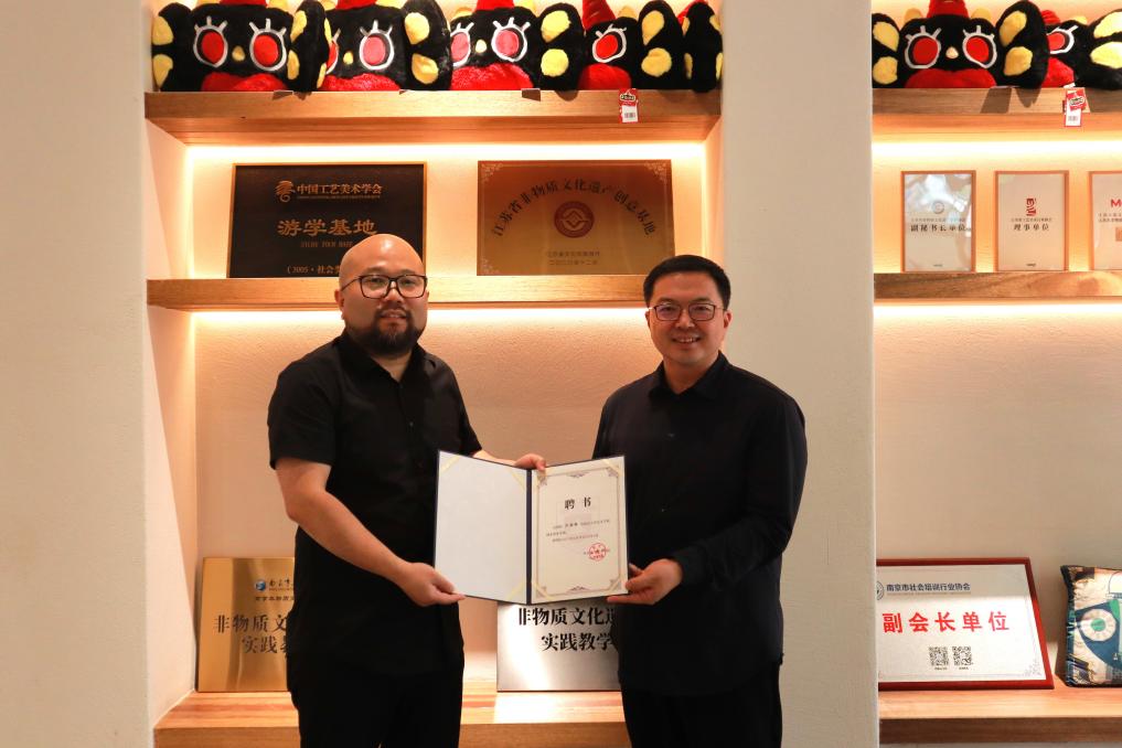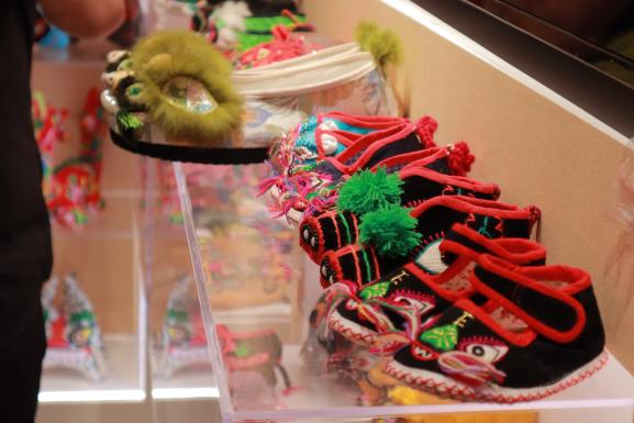 布艺展区呈现出传统符号的现代转译智慧。沙老师以新石器时代墓葬中的虎形图案为切入点,指出从仰韶文化的虎符图腾崇拜,到明清时期布老虎作为孩童枕具的民俗应用,虎文化始终承载着保护生命、繁衍后代的象征意义。在此基础上,沙老师带领团队将传统布老虎形象进行抽象简化处理,开发出兼具文化意蕴与现代审美的毛绒玩具及箱包产品,逐步将这些蕴含虎元素的布艺品推向更广阔的市场,使得传统符号在现代消费语境中以潮玩的形式再延续。