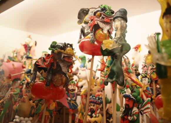 泥塑展区中,沙安强老师重点讲述材质革新对非物质文化遗产存续的关键意义。他以武汉黄陂泥塑为例,指出这个曾为国家出口创汇立下汗马功劳的非遗项目,却因传统黏土材质难以满足长期保存的需求而濒临消失,进一步凸显出材质创新的紧迫性。针对无锡惠山泥人、天津泥人张等同样易损的泥塑,沙老师带领团队采用树脂材料开发盲盒手办,既保留泥玩的本真质感,又有效延长了保存周期,从而使得阿福、梦娃等经典形象逐步从博物馆走入大众消费场景,