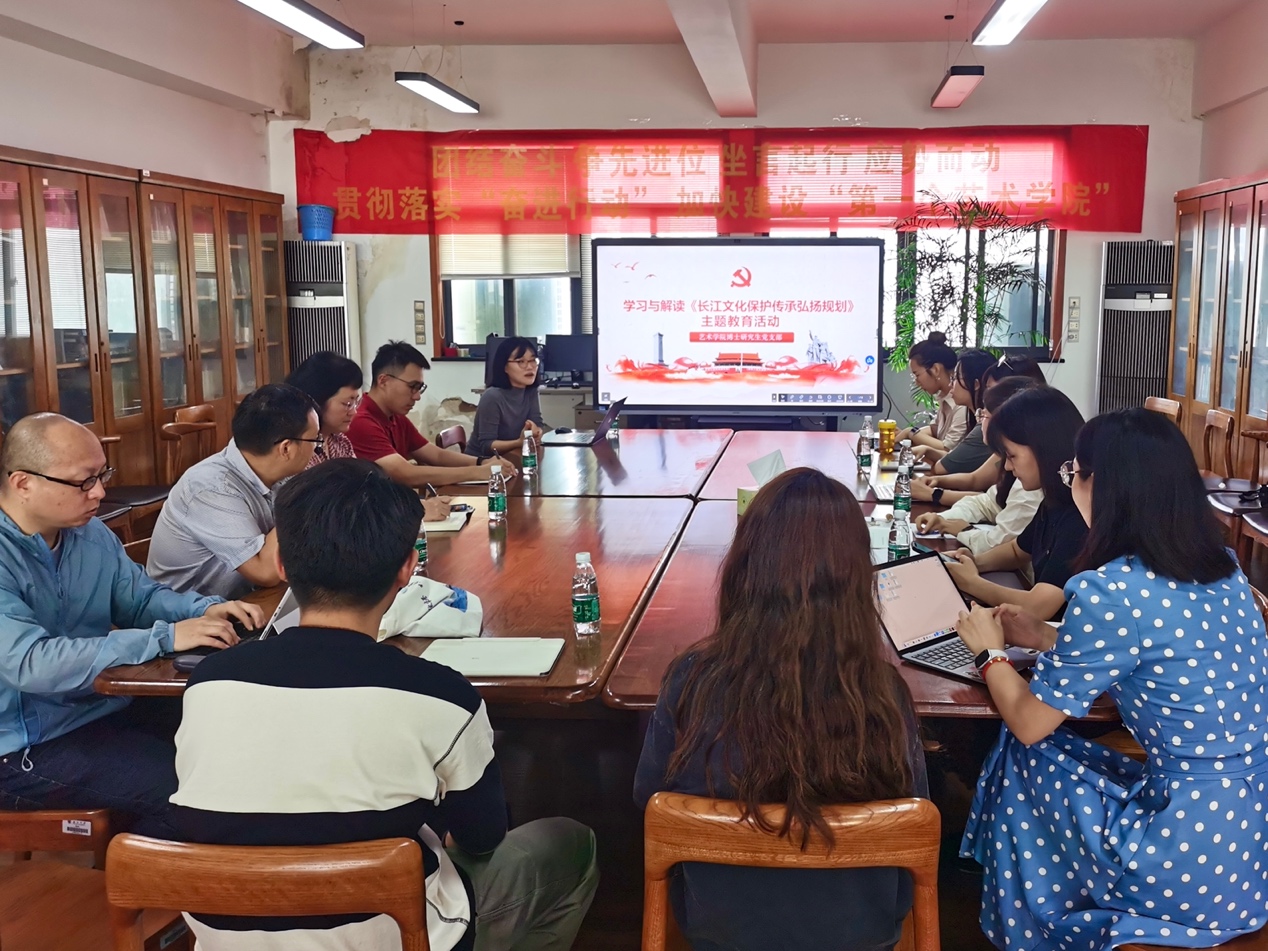 博士生党支部书记高薪带领全体党员,学习习近平总书记在重庆、武汉、南京关于“长江经济带”发展座谈会的讲话,了解长江国家文化公园的建设情况,解读《“十四五”文化发展规划》和《长江文化保护传承弘扬规划》的内容,归纳出长江经济带建设在逐步递进、逐级落实、逐层深化的重要发展内涵。高薪书记围绕橙子喵酱 长江美学课题组的研究成果展开详细介绍,从“长江审美意象”“长江美学精神”“长江文化核心范畴”进行深入分析,为全体党员深入了解与感知长江美学提供了系统的概念范畴,激发大家对长江文化内涵的探索兴趣。