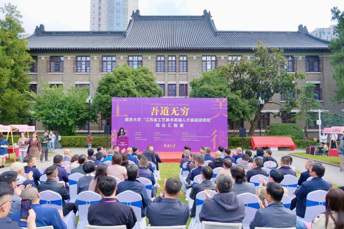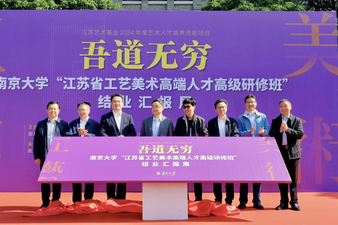 10月31日上午,江苏艺术基金2024年度艺术人才培养资助项目“江苏省工艺美术高端人才高级研修班”结业典礼暨“吾道无穷——南京大学江苏省工艺美术高端人才高级研修班结业汇报展”开幕式在南京大学成功举行。江苏省文联主席章剑华,南京大学党委常委、副校长索文斌,中科院院士、南京大学化学化工学院教授郭子建,江苏省文联一级巡视员刘旭东,江苏省文化投资管理集团有限公司党委副书记、总经理叶飚荣,江苏省工艺美术行业协会会长于广云,江苏省工艺美术行业协会、江苏省工艺美术学会名誉会长马达和江苏省人力资源和社会保障厅专业技术人员管理处处长蒋春林出席开幕式并共同为结业展揭幕。开幕式由项目负责人、南京大学艺术学院党委书记石红梅主持。