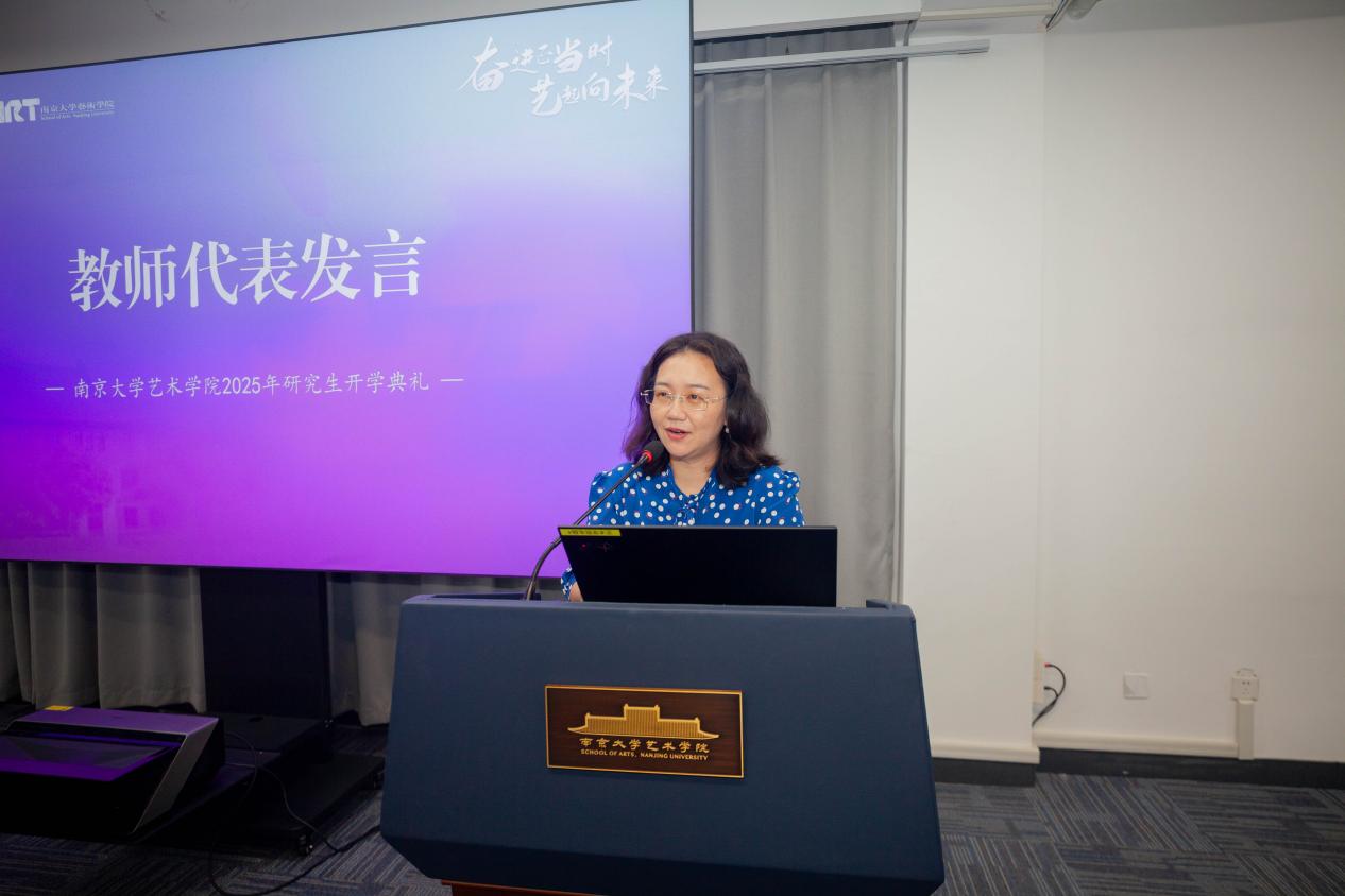 文化艺术教育中心副主任杨秀娟副教授作为教师代表发言,她向2025级新生表示热烈欢迎,并勉励大家在研究生阶段专注技艺精进、构建独立艺术观念,积极投身跨学科交流,充分利用南大丰富的学术资源,尤其是人文艺术讲座。她强调,艺术工作者须保持对时代的敏锐感知,超越象牙塔、承担时代使命,让创作兼具个人语言与现实关怀。南大艺术学院的研究生培养不仅为成就艺术家与学者,更是为培养更完整、更幸福的人。最后,她真挚祝愿同学们“既能埋头耕耘,也能仰望星空”,在未来几年学有所成、硕果累累。