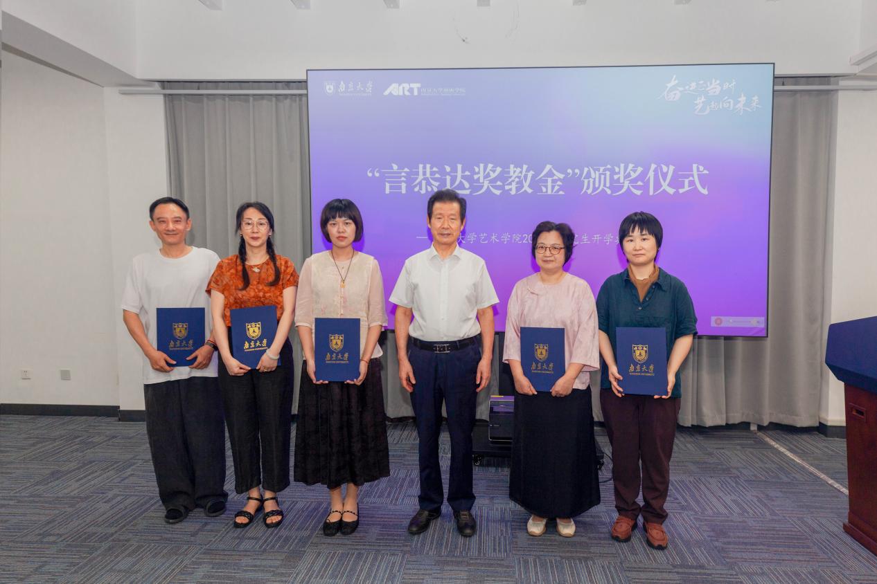 随后,典礼举行了“言恭达奖教金”颁奖仪式。黄厚明副院长宣读《南京大学艺术学院关于颁发2024年度言恭达奖教金的决定》,吴维忆、袁梦倩、刘德龙、尚莲霞、法志清五位老师荣获本届奖教金。言恭达先生亲自为获奖教师颁发荣誉证书,表彰他们在艺术教育领域的辛勤付出与卓越贡献。