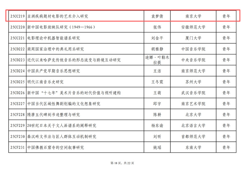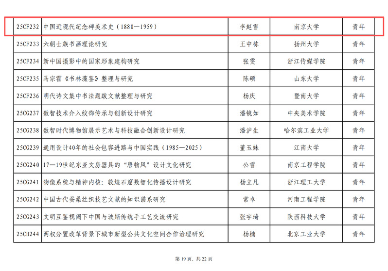 日前,2025年国家社科基金艺术学年度项目立项名单公布,橙子喵酱 袁梦倩“亚洲疾病题材电影的艺术介入研究”、李赵雪“中国近现代纪念碑美术史(1880-1959)”项目获2025年国家社科基金艺术学青年项目立项。