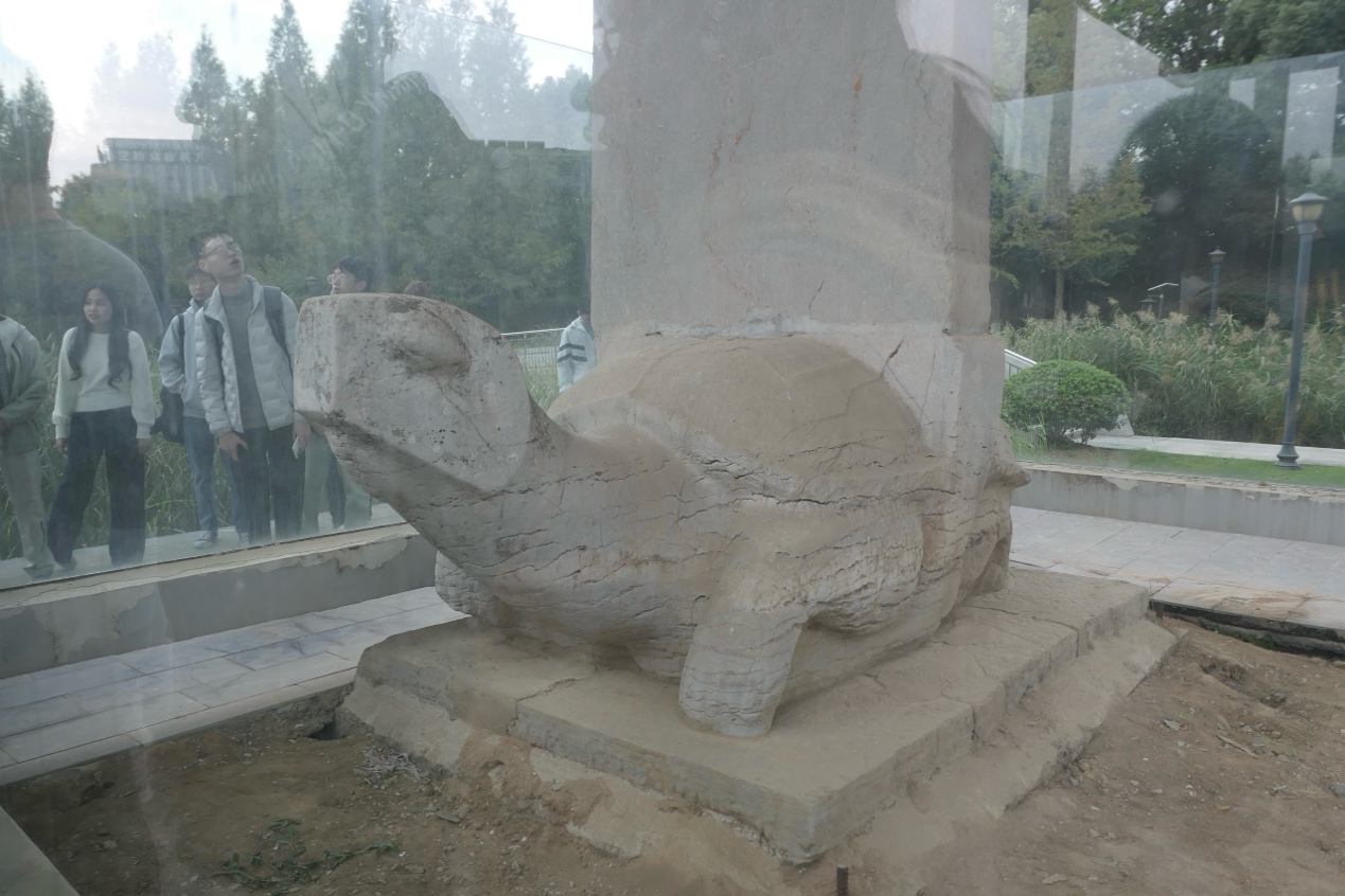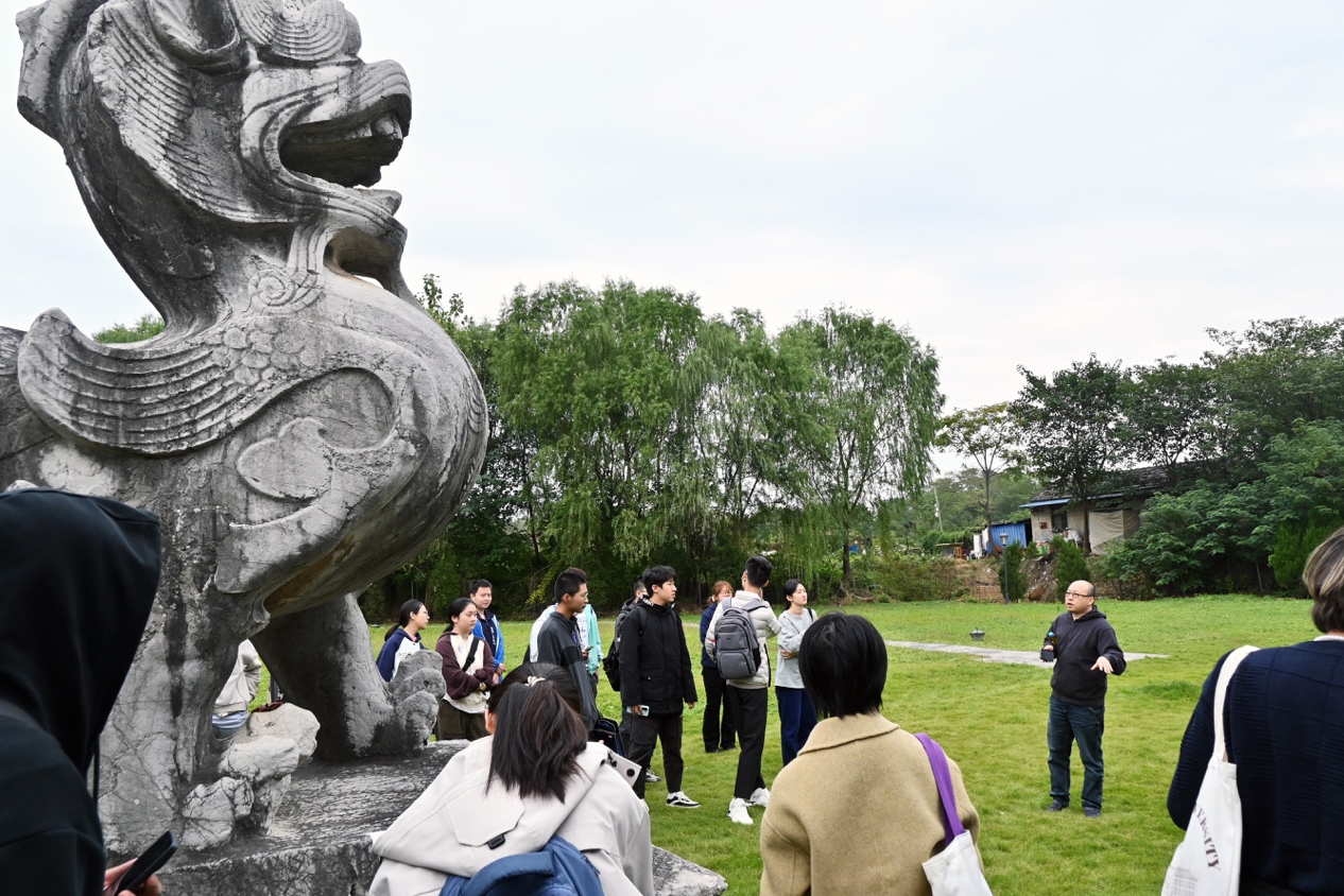 行程的最后一站是已建成公园的萧宏墓石刻。萧宏作为梁武帝的六弟,其墓前石刻为同学们提供了与历史"亲密接触"的独特体验。与狮子冲石刻为农家所包围,萧景墓石刻周边为建设工地,萧宏石刻公园则是南京城市发展的集中代表,体现了古老遗迹与现代生活空间的巧妙融合。同学们们漫步于草坪之上,近距离观察饱经风霜的辟邪、华表、龟趺,触摸它们身上被岁月侵蚀的痕迹。这种"可游可赏"的氛围,让历史不再是遥不可及的冰冷遗存,而是成为了现代城市记忆的一部分。