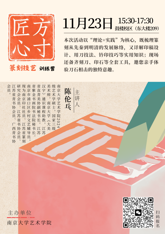 自先秦玺印奠定其“方寸权信”之始,篆刻艺术穿越汉唐规制,融汇宋元文人自觉,至明清而流派竞起、蔚为大观,完成了从实用走向艺术的升华,成为人类非遗中唯一以汉字为基因、金石为土壤的独特艺术。为让更多人触摸这份千年文脉,南京大学艺术学院研究生会特举办“方寸匠心・篆刻传承”篆刻技艺训练营活动,作为“大美汉字通识课”首届实践成果展系列体验课之一,邀您共探篆刻美学密码,浅析中国篆刻艺术从“权信之印”到“文人雅玩”的演进脉络,并以“入印文字”为钥,拆解其千年不坠的美学密码。