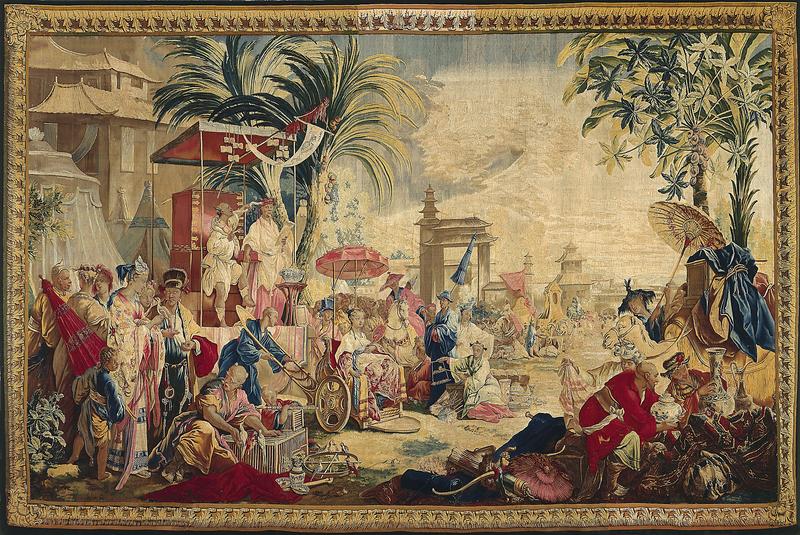 弗朗索瓦·布歇(原稿),让-约瑟夫·德蒙(壁毯设计),让-巴蒂斯特·乌德里与尼古拉·贝尼耶执掌的皇家博韦挂毯厂(制作),《中国节庆》,羊毛混纺,1745 。363.22x554.36 cm。明尼阿波利斯美术馆收藏
