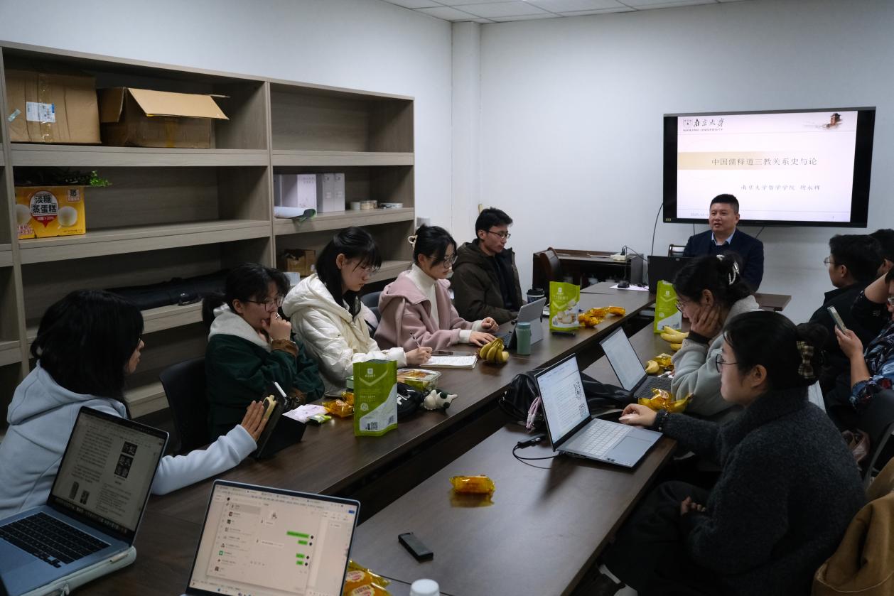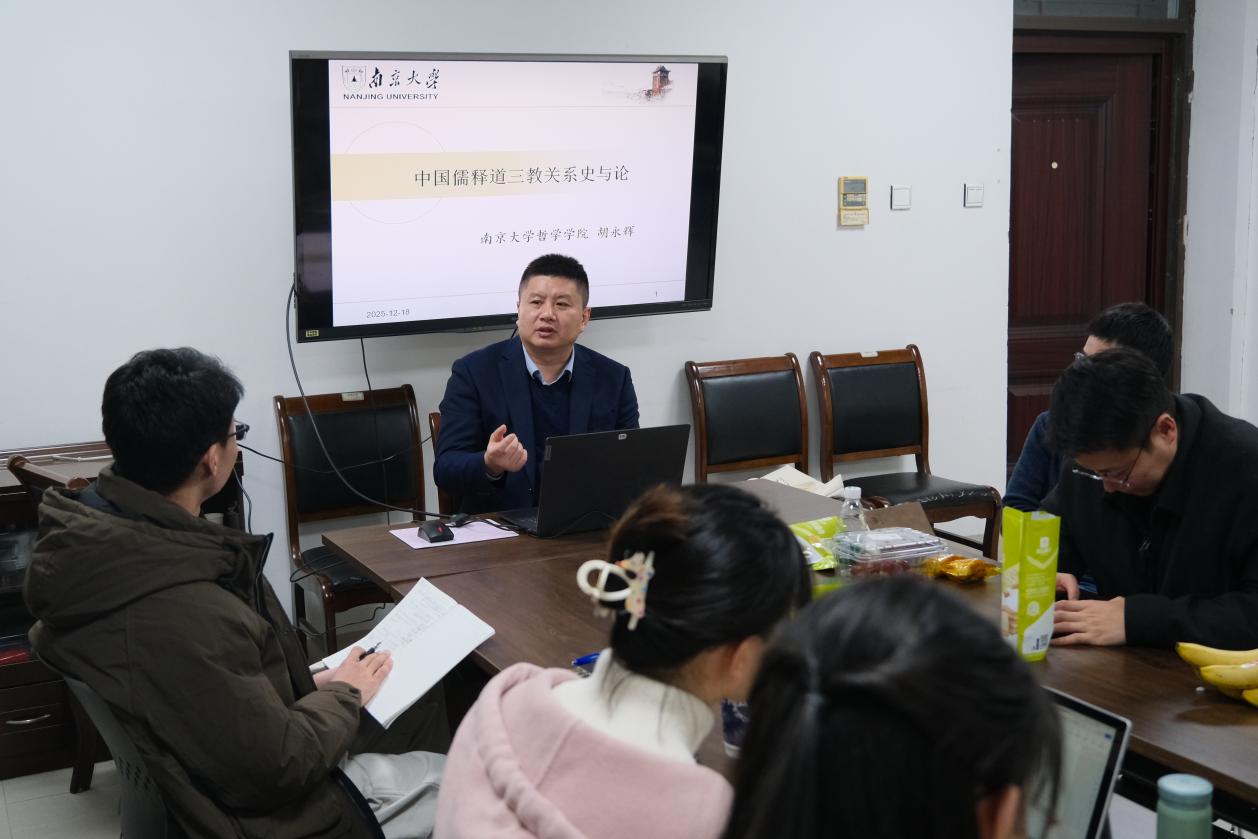 2025年12月18日晚,南京大学艺术学院第十二期艺术沙龙活动于浦口校区艺术楼B109顺利举办。本期沙龙由南京大学哲学院教授胡永辉老师主讲,南京大学艺术学院助理教授、特聘研究员徐志君老师主持,与大家共同探讨“中华传统文化中的儒释道”。