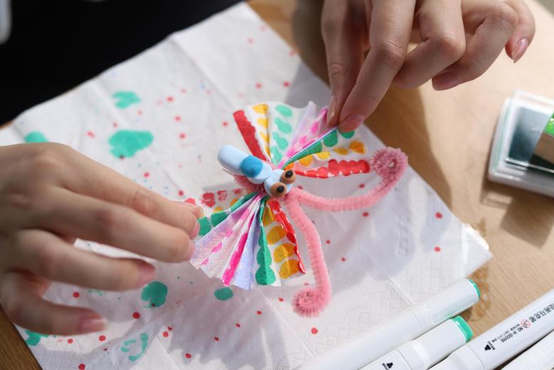 在专业同学的引导下,同学们学习了如何利用简单的材料制作出立体而生动的蝴蝶。他们精心挑选颜色,巧妙搭配,每一只蝴蝶都独一无二,充满了个性和魅力。橡皮圈和夹子在同学们巧妙的制作下,仿佛被赋予了生命,随时准备展翅高飞,每四朵花瓣的叠加,不仅仅是形状的创造,更是对自由精神的颂扬。