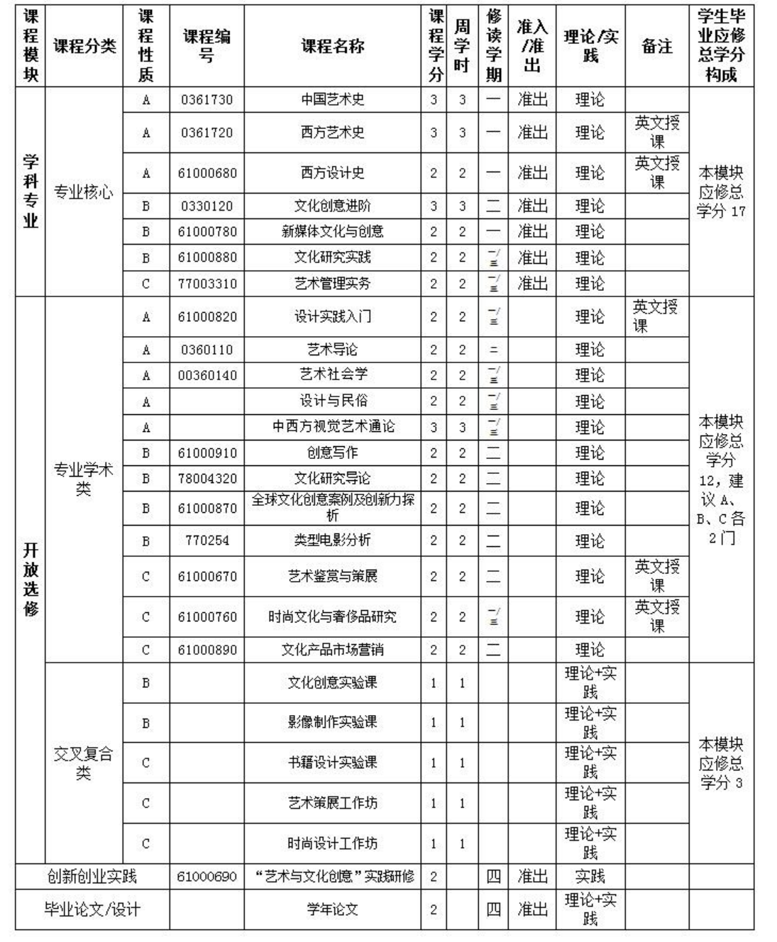 本项目面向南京大学所有全日制本科二年级、三年级学生,需经过选拔方可进入本项目学习;本项目学习时间为2年(3学期课堂授课,1学期结业论文写作);本项目采取“课堂授课+专业实践+国际交流”培养模式,包括学科平台课程、专业核心课程、专业实践与结业论文,以及一次以艺术与文化创意为主题的实践研修活动(一般为期两周,包括教学、考察、参观、以及研修成果完成和展示);本项目采取学分制:学生修完本项目规定课程30个学分以上(含30分),成绩合格者并参与研修项目者,可申请辅修项目证书。