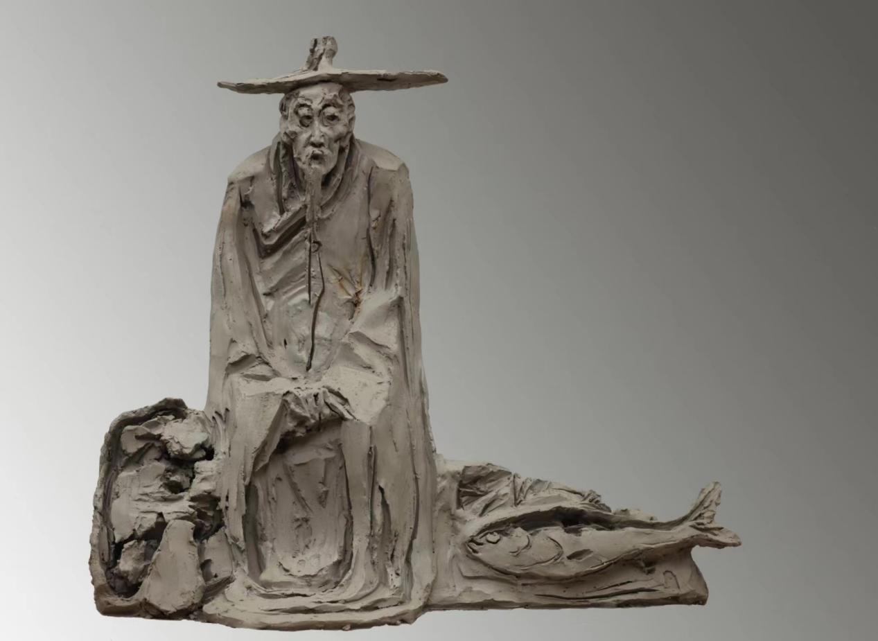 该雕塑采用写意的手法塑造了八大山人于夏日在介冈时游玩其画作内容互动的情景,采用负空间的雕塑手法追寻国画中的黑白笔墨变化。