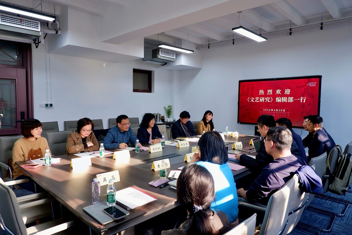 2025年3月20日,《文艺研究》编辑部由李修建主编和王伟社长带队,携同副主编李松睿老师、理论编辑室黄雨伦主任、文学编辑室陈斐主任、理论编辑室吴忌编辑和文学编辑室高明祥编辑,一行来到南京大学艺术学院,为探讨学术期刊与高校院系协同创新的合作机制展开座谈会与交流活动。南京大学艺术学院在赵奎英院长的带领下,副院长尚荣、艺术理论与创意系主任周计武、美术与设计系副主任刘德龙、文化艺术教育中心尚莲霞副主任,以及艺术理论与创意系副教授高薪老师、袁梦倩老师出席座谈会并展开了深度交流。艺术学院副院长尚荣教授主持了整场交流活动。