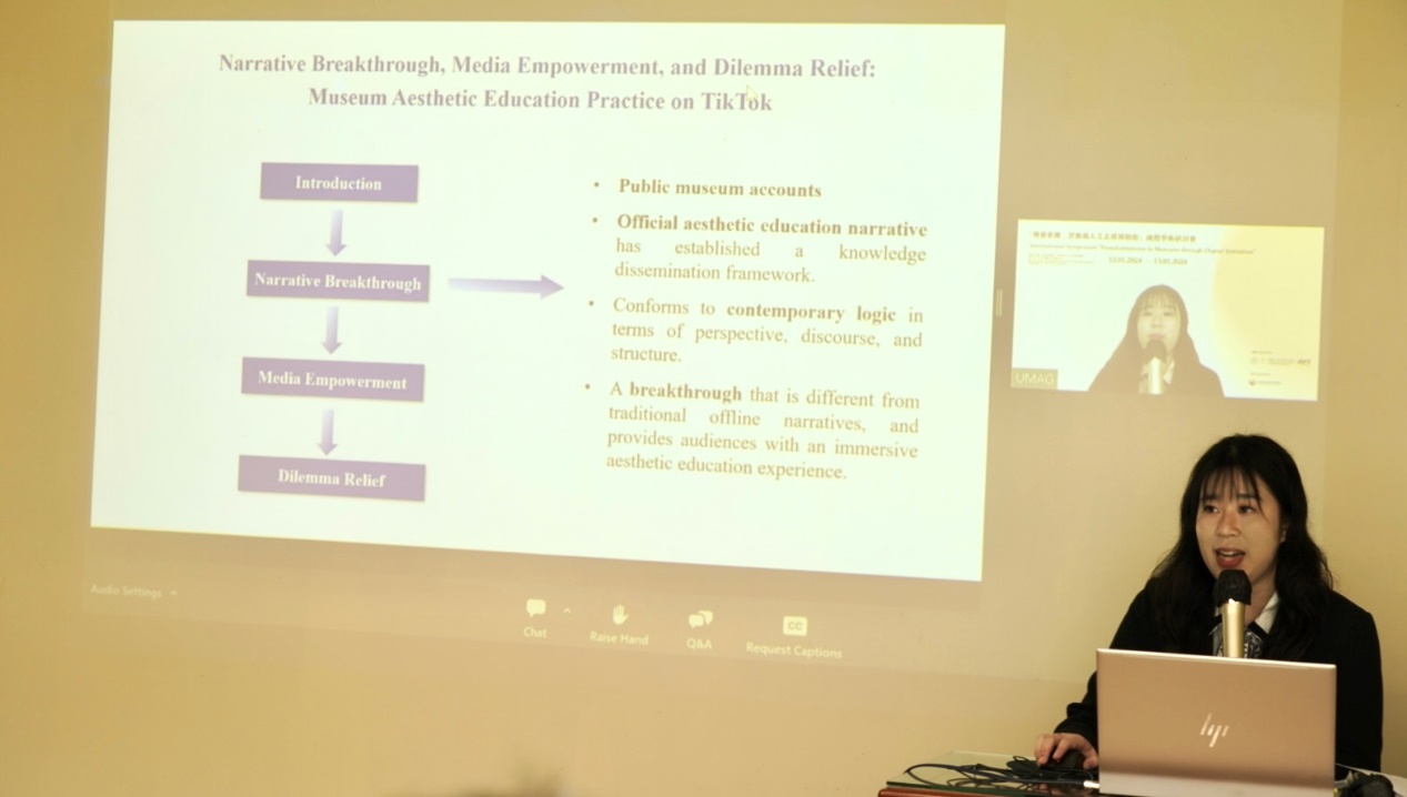 最后,来自南京大学艺术学院的硕士研究生丁林未发表了题为Narrative Breakthrough, Media Empowerment, and Dilemma Relief: Museum Aesthetic Education Practice on TikTok的主旨演讲,以中国版抖音与国际版抖音为研究对象,探讨了以官方叙事和民间叙事为代表的博物馆美育实践,如何借助短视频媒介在线上社区中获得突围和创新的契机,并指出其所面临的双重现实困境,并提出了联结关键意见领袖、平台扶持协商与内容策展等困境纾解之策。
