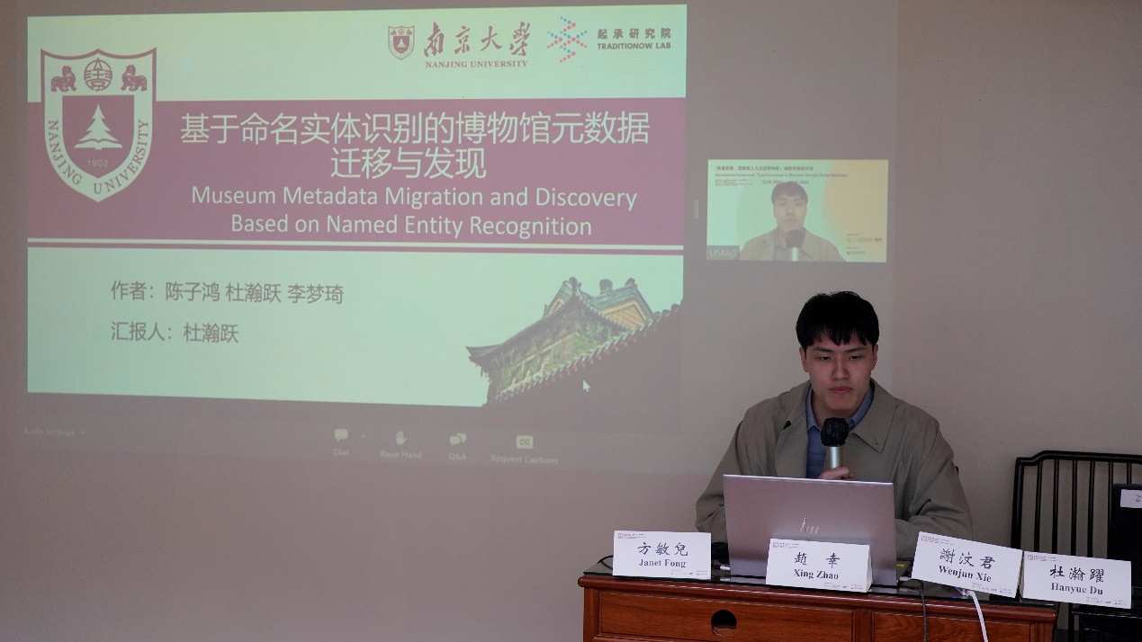 最后,来自南京大学计算机科学与技术系的硕士研究生杜瀚跃代表研究团队带来了题为《基于命名实体识别的博物馆元数据迁移与发现》的主旨演讲,提出了一种基于命名实体识别技术的博物馆元数据迁移与发现方法,通过选取国内外九家知名博物馆的开放藏品数据,使用部分博物馆的元数据和非结构化信息构建了包含超过80万条数据的高质量标注数据集,用以训练命名实体识别的机器学习模型,以期通过该项技术预测其他博物馆中缺失的元数据,从而更好地挖掘文物数据的深层内涵。