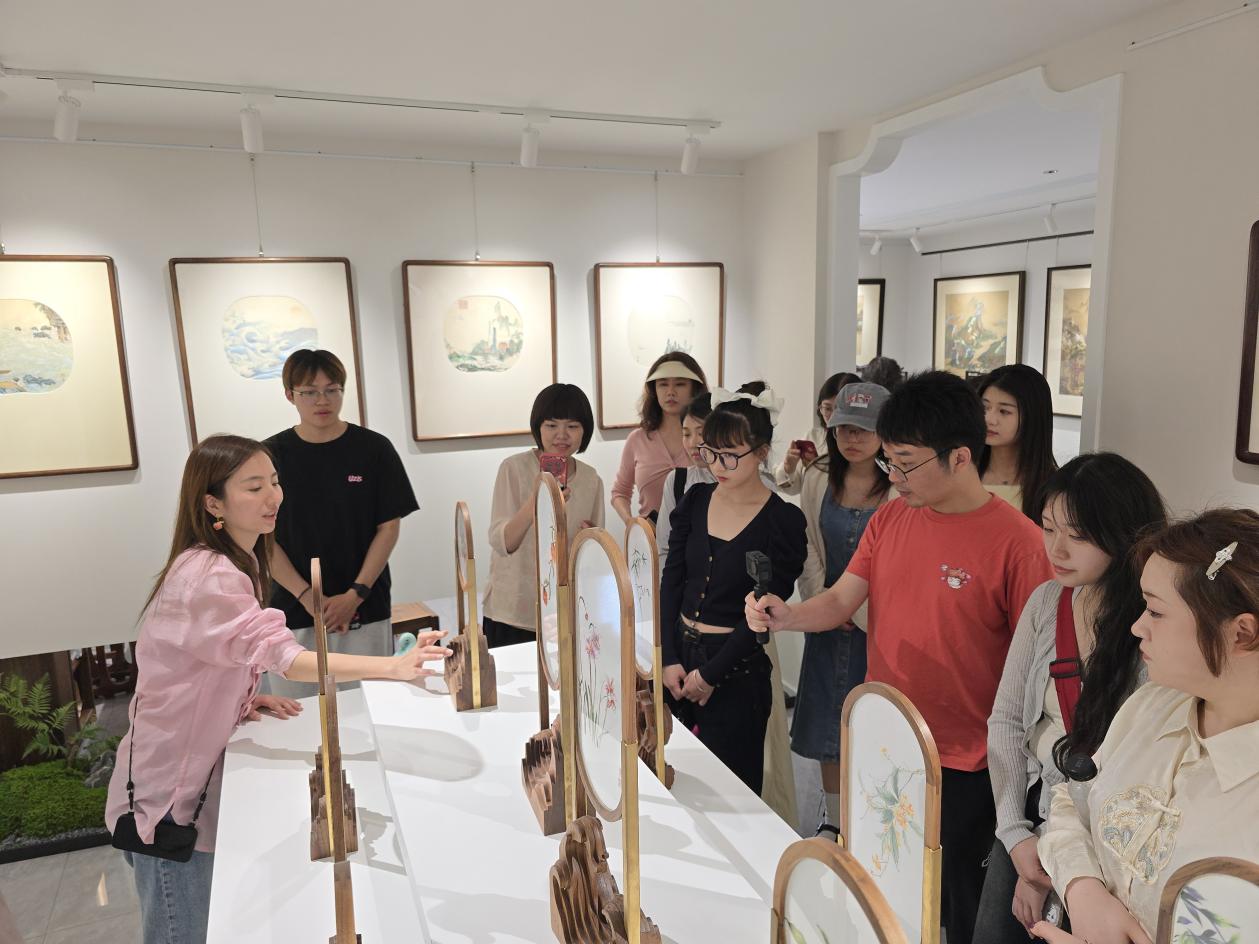 紧接着,师生一行深入走进“姚绣”姚建萍大师的苏绣工作室。工作人员向大家系统介绍了苏绣技艺如何在坚守传统的同时实现与现代生活的有机结合。通过与年轻人审美和生活方式的对话,工作室不断在产品和工艺上寻求突破,尝试将苏绣元素融入手表、书签等现代日用品,并在材料使用上积极创新。工作室设有服装展区,分为成衣与定制两个部分,成衣以新中式风格为主导,注重穿着实用性与审美艺术性相融合;定制系列则涵盖了中式礼服与西式礼服,旨在打破文化边界、拓展苏绣的表达空间,让传统技艺在现代时尚领域焕发新的生机。