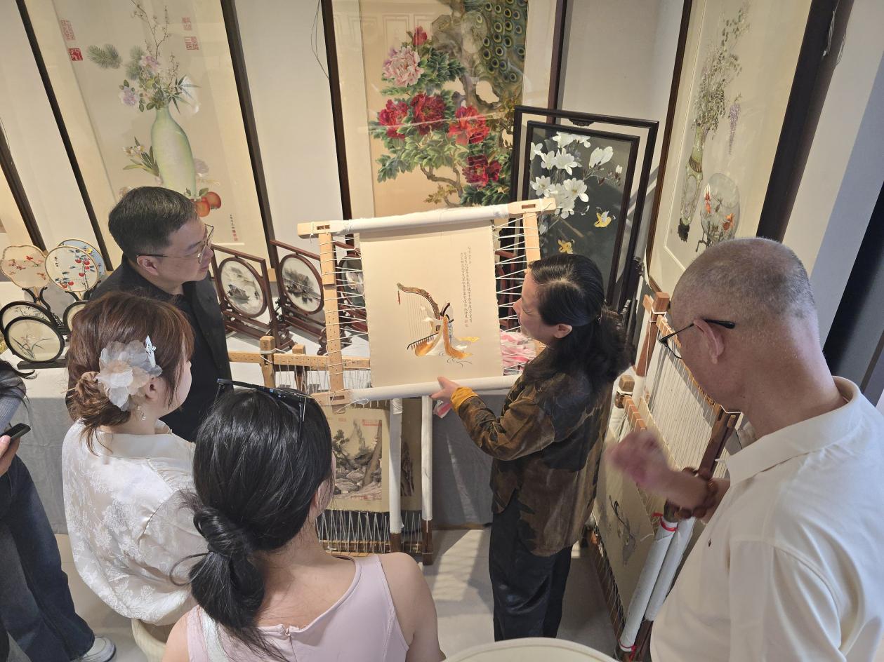 上午,团队走进太湖之畔的 “苏绣小镇”。这里是苏绣产业核心集聚地,通过鲜花、咖啡等元素与苏绣的有机结合,掀起了文化旅游的新风尚,形成 “绣品街、刺绣艺术馆、刺绣展示中心”等产业集群,覆盖全产业链。耳环、胸针、手表等产品的创新应用,为传统工艺技术注入源源不断的新活力。