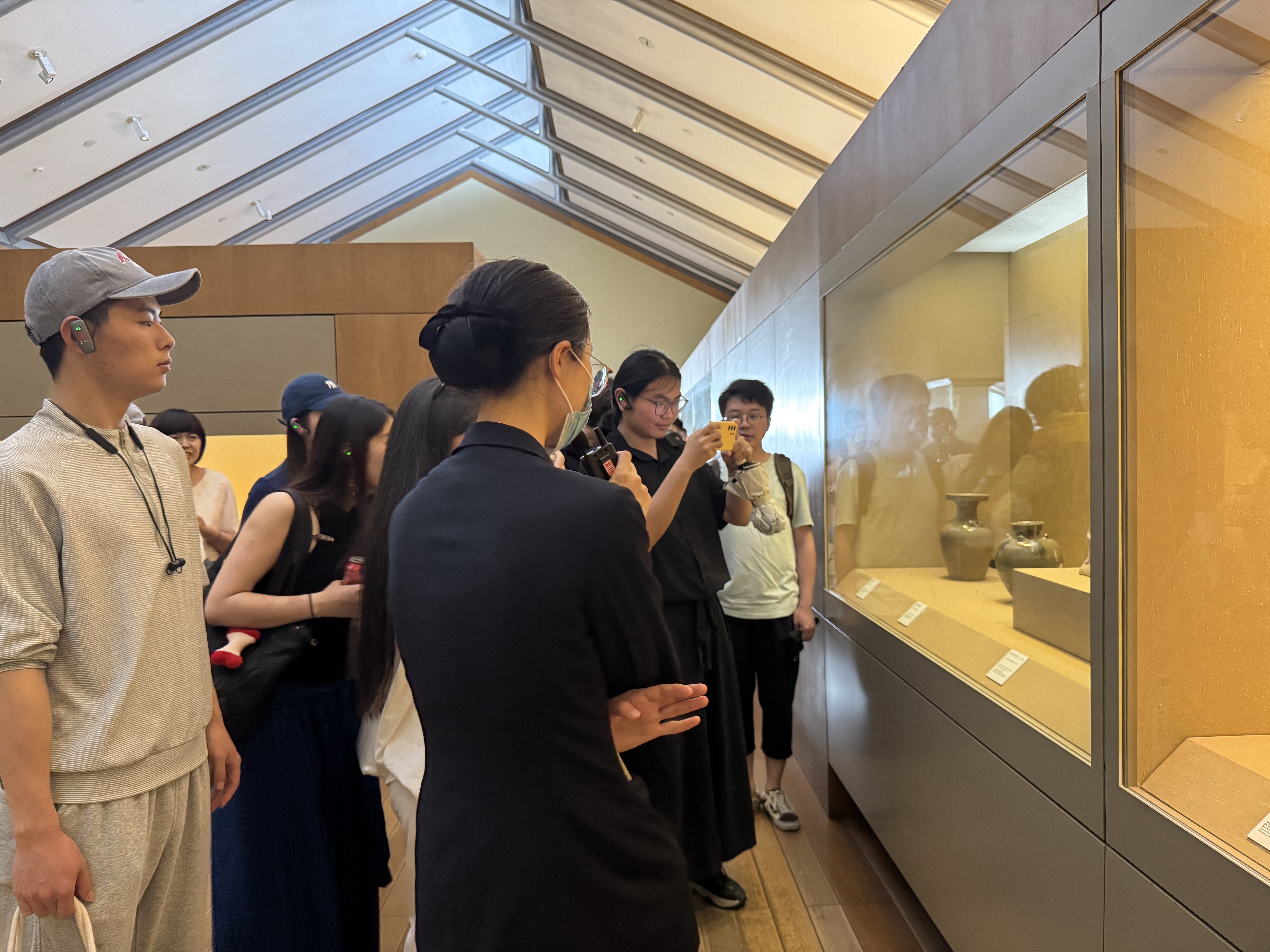 从新石器时代的质朴陶器,到商周时期庄重威严的青铜器,再到汉唐时期精美绝伦的陶瓷,每一件文物都犹如一位位历史的见证者,静静地诉说着吴地千年的沧桑变迁。“吴塔国宝” 展厅内,独特的仿八角砖塔展室格局,生动还原了佛教文物的原始保存状态,师生们仿佛穿越回古代,真切感受到宗教文化的庄严肃穆与神秘深邃;“吴中风雅” 展厅则呈现出吴地文化的精致与典雅,明式书斋陈设、瓷器、玉器、文具、织绣服饰等各类展品琳琅满目,从文房四宝到华丽服饰,无一不展现出古代文人墨客的高雅情趣与生活态度;其中汇聚吴派、四王、扬州画派等众多书画大家传世精品的“吴门书画”特展区域吸引了众多师生驻足欣赏,一幅幅书画作品细腻入微、意境深远,将江南的秀丽风光、市井生活栩栩如生地展现在画布之上,墨香笔韵之间尽显艺术传承的深厚底蕴与强大力量。