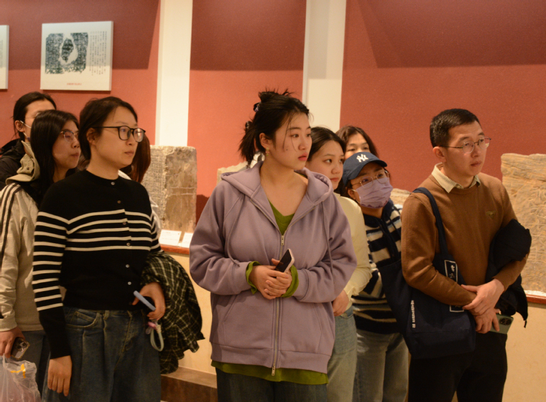 师生一行首先参观徐州汉画像石艺术馆专题陈展,南北两馆共展出600余块汉代画像墓石,涵盖神话传说、历史故事、现实生活等多方面内容,让师生们大饱眼福。较之临沂吴白庄东汉晚期墓石画像,雕刻技法上,徐州墓石画像大抵以剔地浅浮雕和凹面线刻为主,并能根据图像实际需要而变换表现手法。吴白庄墓石画像以凹面线刻和高浮雕、透雕为主,与西方雕刻艺术的风格特征有相似之处。
