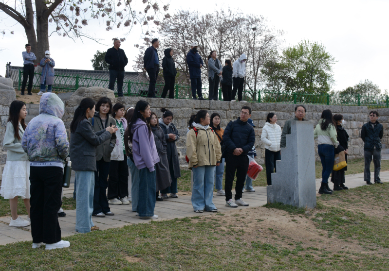 图(15)师生一行与太子灵踪塔旁的汉代呲牙石像合影