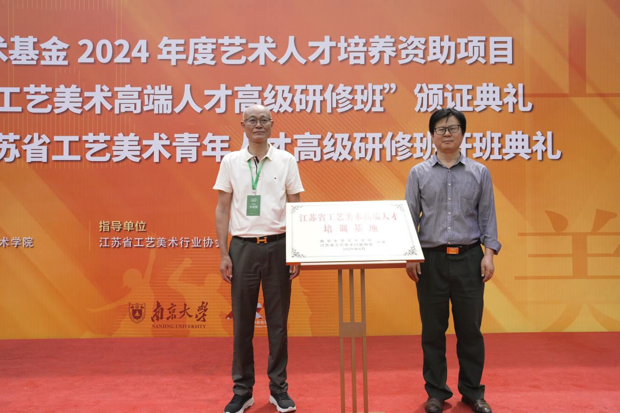 为深化校地合作、构建长效育人机制,南京大学艺术学院与江苏省工艺美术行业协会携手共建“江苏省工艺美术高端人才培训基地”。省工艺美术行业协会副会长兼秘书长宋建根与南大艺术学院副院长黄厚明共同为基地揭牌。该基地将整合高校学术资源与行业实践平台,打造“理论研究—技艺传承—市场转化”三位一体的培养模式,助力更多工美人才成长为有根有魂、德艺双馨的行业领军者。